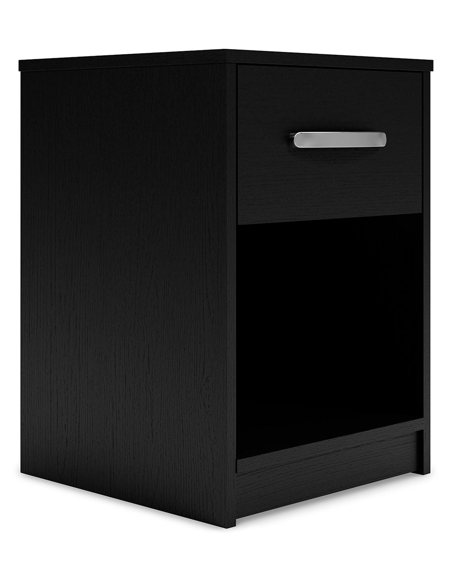 Practical and attractive, this nightstand blends seamlessly with modern decor and makes a smart addition to a bedroom. The smooth-gliding drawer on metal ball bearings is ideal for bedside essentials. An open cubby provides a nice place for a storage basket or vase. The nightstand's curved metal pull in a brushed nickel-tone finish adds to the streamlined aesthetic. Combine with other units in the collection to create a room that’s sleek and stylish.