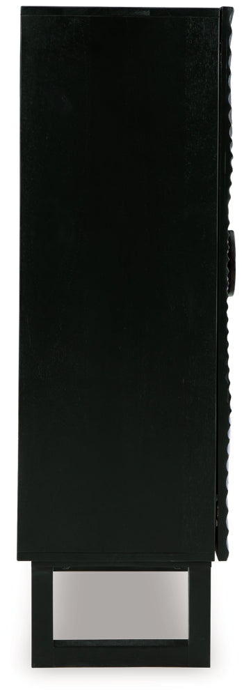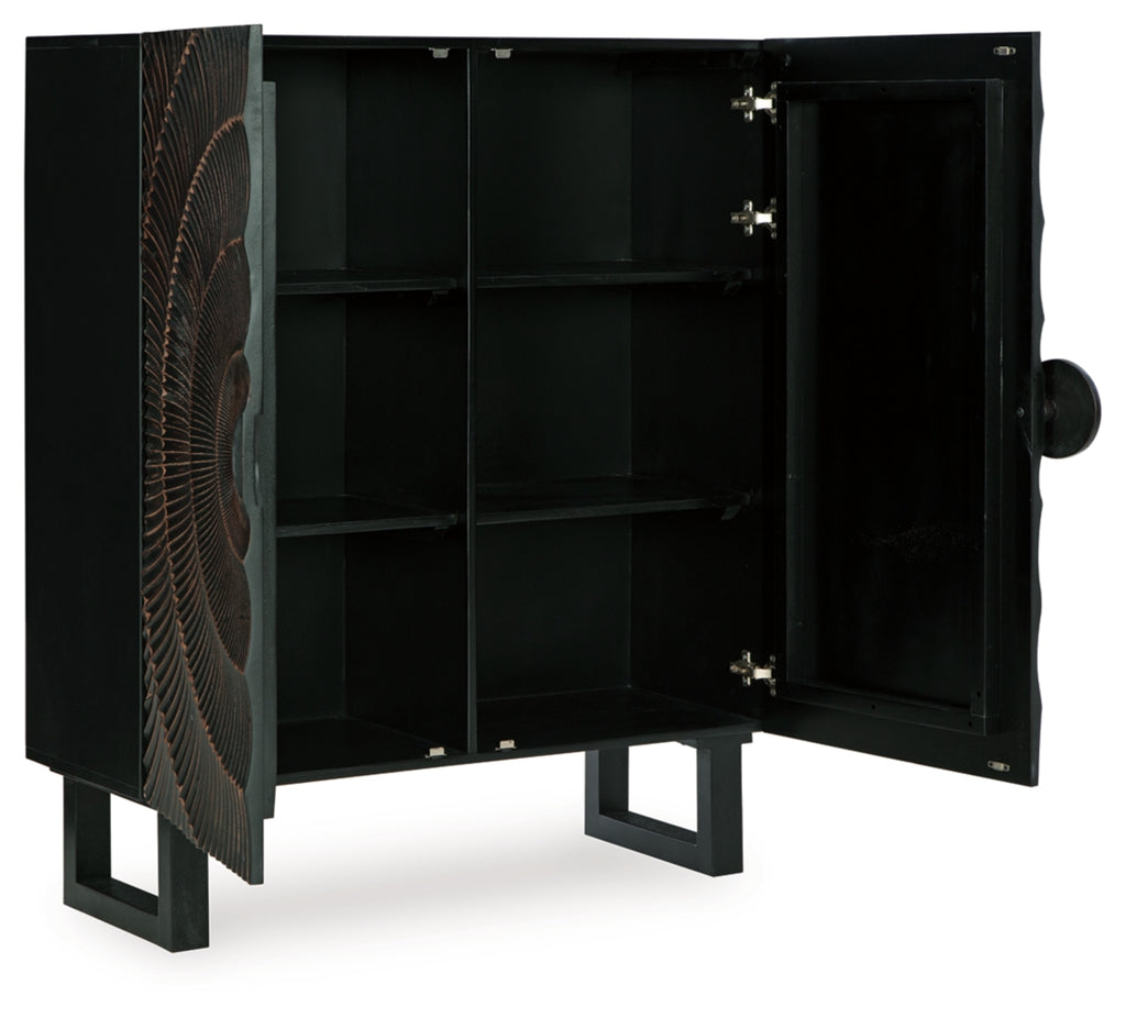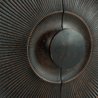 High style is on the rise with this wood accent cabinet. Its stunning doors, graced with a carved sunburst pattern and oversized wood pull, open to reveal two shelves. A distressed black finish adds contemporary flair. Whether this cabinet is accommodating storage needs or hiding clutter, it's truly a showpiece.