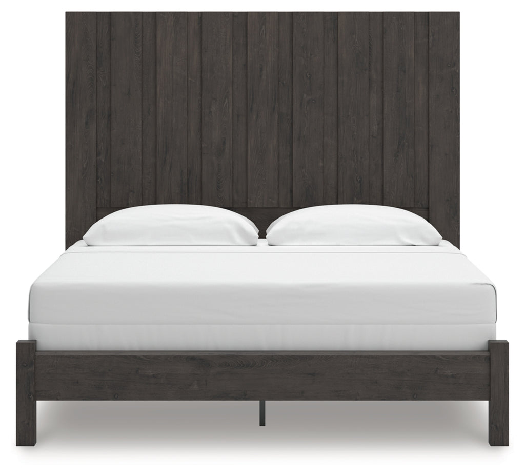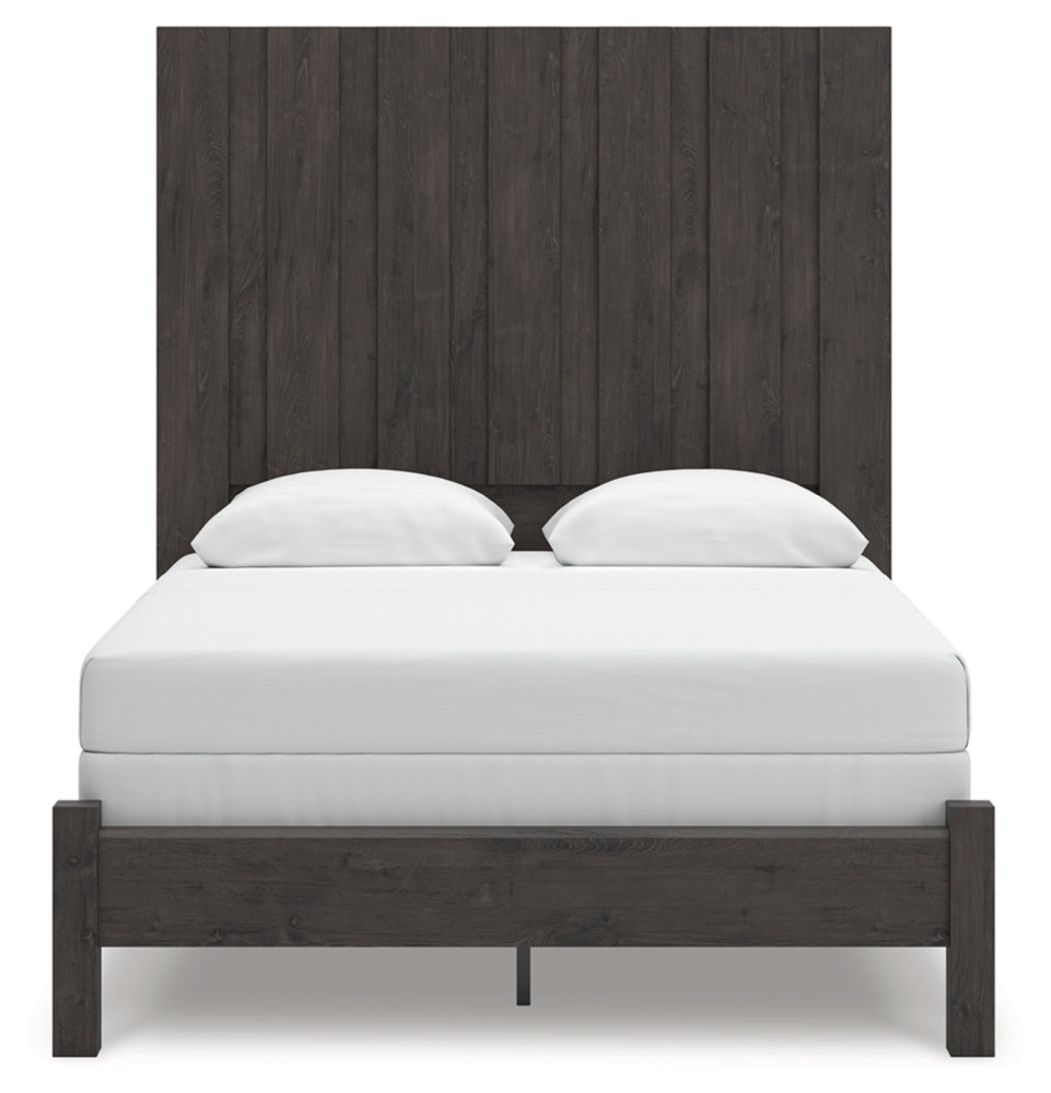 Find serene simplicity in the clean lines and dark neutral tones of this king panel bed. It’s a sincere approach to modern elegance, giving you high style at a great value. Vertical planks decorate the generously scaled headboard to give the illusion of additional height, polishing off the piece in grand fashion.