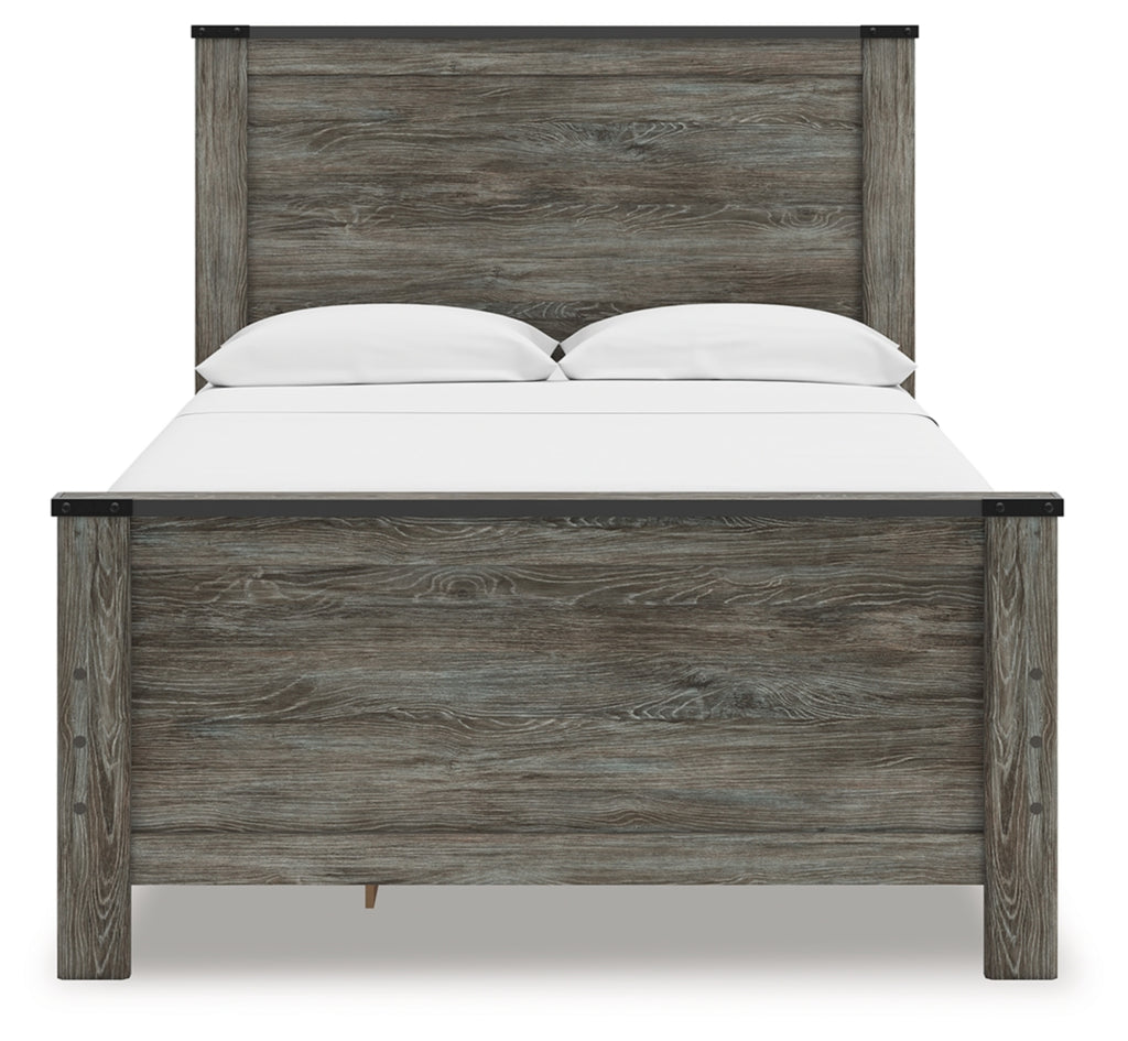Cool, casual style is for all ages. With this full panel bed with storage, they get the function they need plus the refined design you love. Approachably neutral in a rustic warm gray, it’s adaptable enough to pair with an assortment of existing colors and room decor. Faux metal detailing with nailhead accents lends an industrial edge. Need more storage space? Drawers under the bed help floors stay clutter-free.