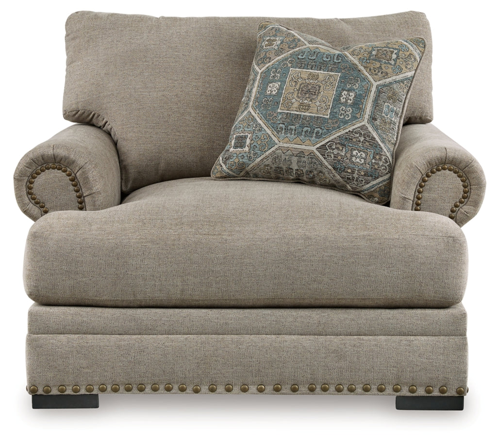 Looking to enhance your home's visual appeal? This oversized chair offers sophisticated design, comfort and elegance with tonal colors, roll arms and nailhead accents. Enjoy optimal coziness as you nestle into luxurious soft upholstery and feather-blend cushions. Perfect for modern spaces, it's just the spot to sit back and relax in style.