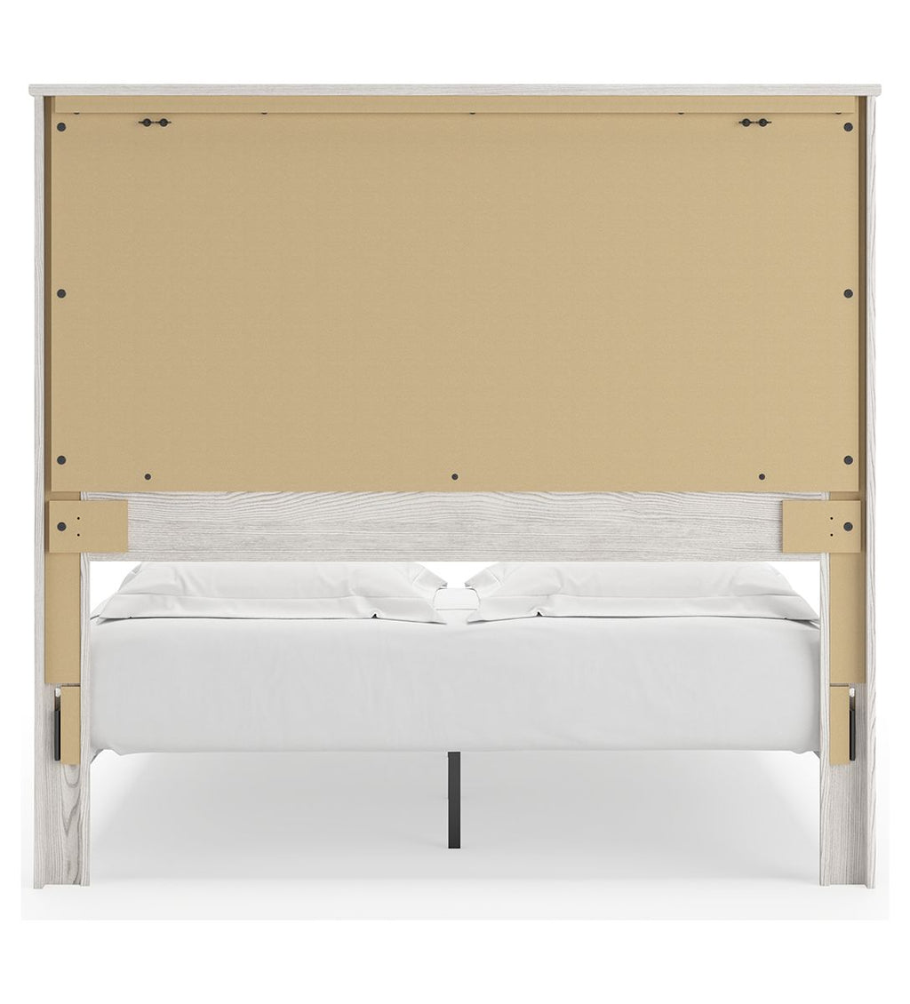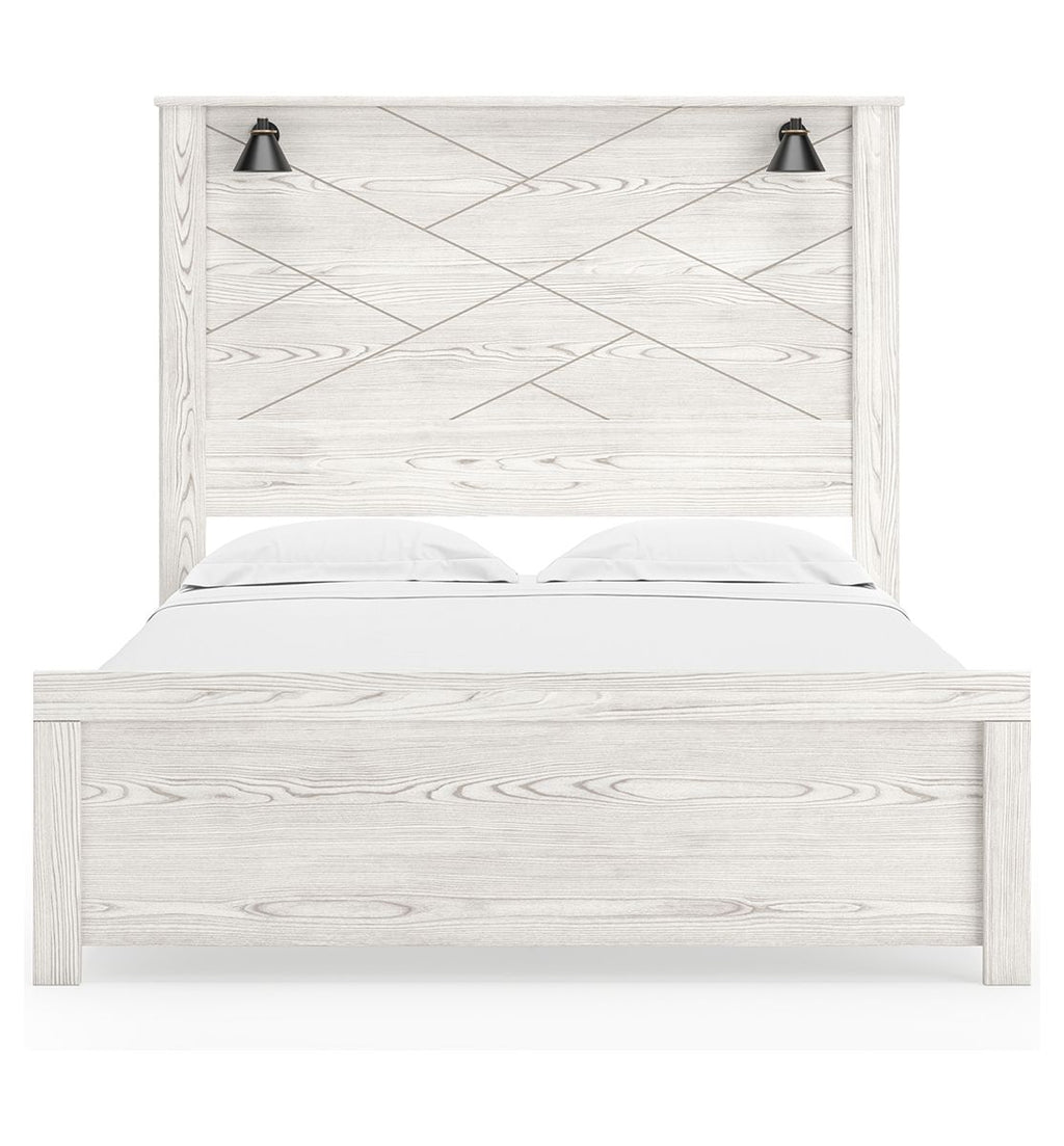 Cool, clean and casually modern. This queen panel bed’s white rustic finish sets the tone for your calming sanctuary. Matte black sconce lights and an abstract design on the headboard bring a fresh look to the bed’s simply stunning profile.