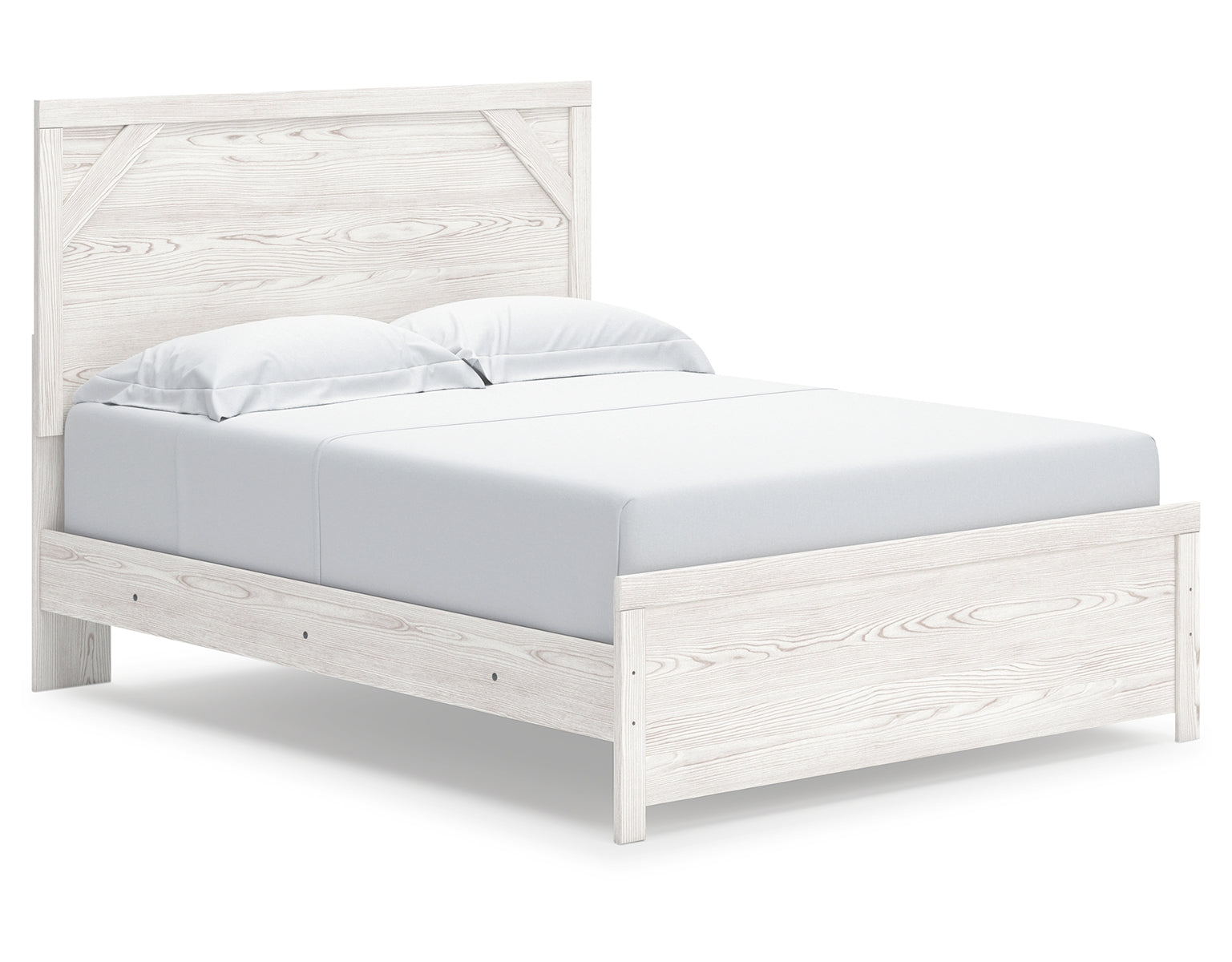 Cool, clean and casually modern. This bedroom package's wispy whitewash and gray finish sets the tone for your calming sanctuary. The bed’s framed elements and cross-brace accents add dimension and authenticity to its simply stunning profile. Smooth-gliding drawers on the storage pieces neatly accommodate your storage needs.