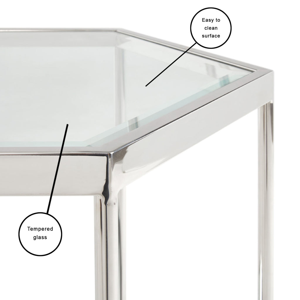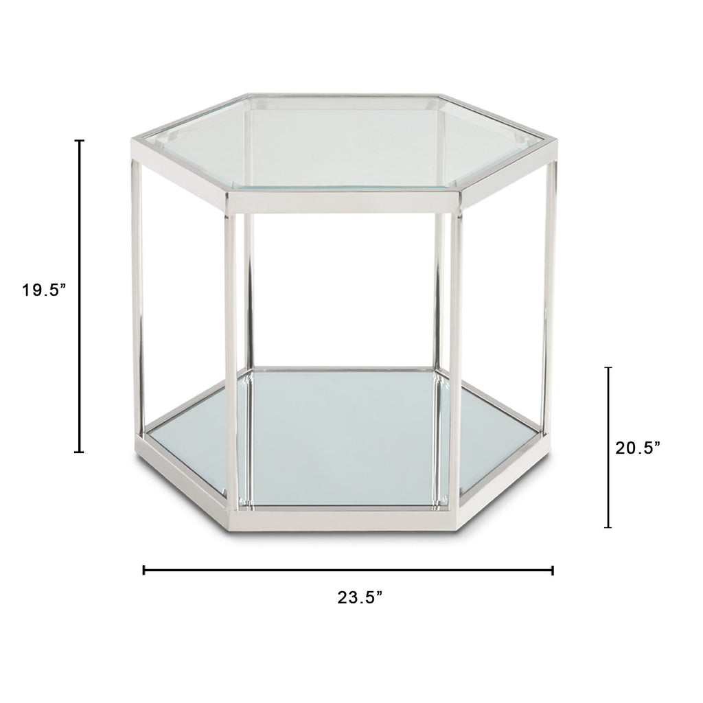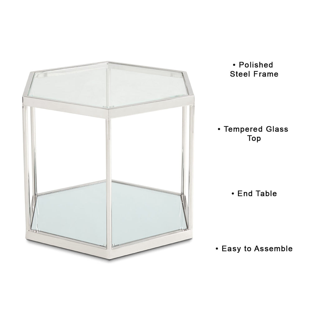 Discover the perfect combination of sleek design and functionality with our Hexagonal Glass Top Silver End Table. This contemporary piece features a lustrous polished steel frame that supports a tempered glass top. The unique hexagonal shape not only adds aesthetic appeal but also provides ample surface space for your books, beverages, or decorative items. Its compact size ensures it fits seamlessly into various spaces, making it an ideal addition to your modern living area.