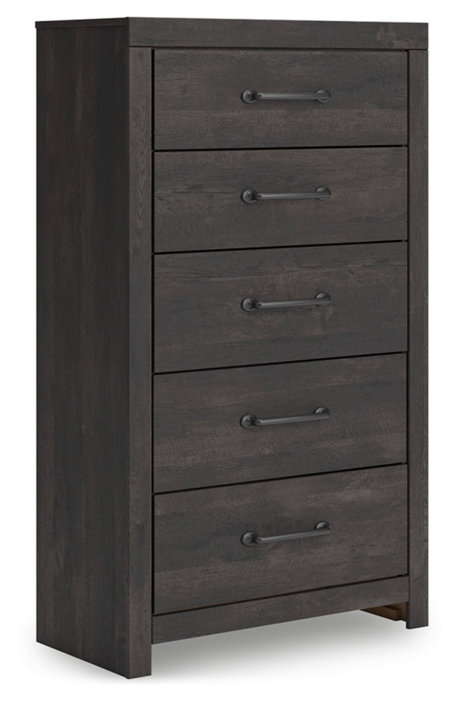 This chest of drawers puts a casually chic twist on everyday function. Its rustic charcoal finish pairs well with other neutrals and pops of color alike, giving you the flexibility to change up your aesthetic as you please. Smooth-gliding drawers keep clothes and bed linens stored in style.