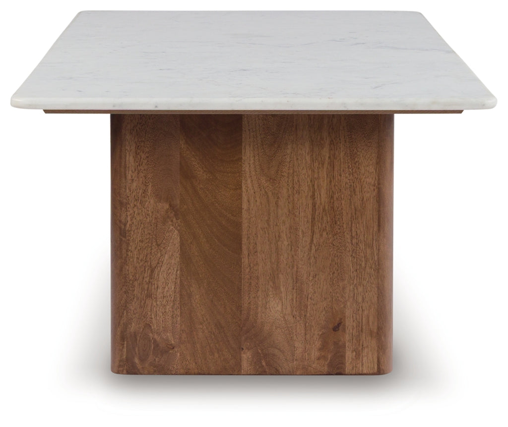 With its back-to-nature sensibility, this occasional table set is a natural fit for outfitting your modern living area. Its clean-lined design lets the beautifully organic quality of the mango wood shine through, complemented by the sleek refinement of marble tops.