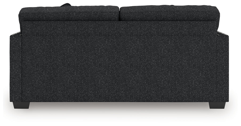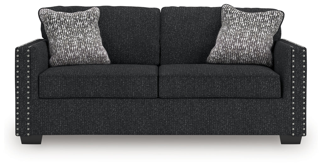 This stunning sofa leaves a lasting impression. Its cozy cushions, chic coal-colored upholstery and striking nailhead trim are a perfect blend of comfort and contemporary design. And here’s the showstopper—ambient red, white and blue LED lighting along the sofa's base. The look is simply wow.