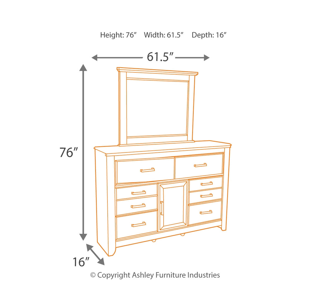 • Includes poster bed (headboard, footboard and rails), 6-drawer dresser with mirror and 5-drawer chest