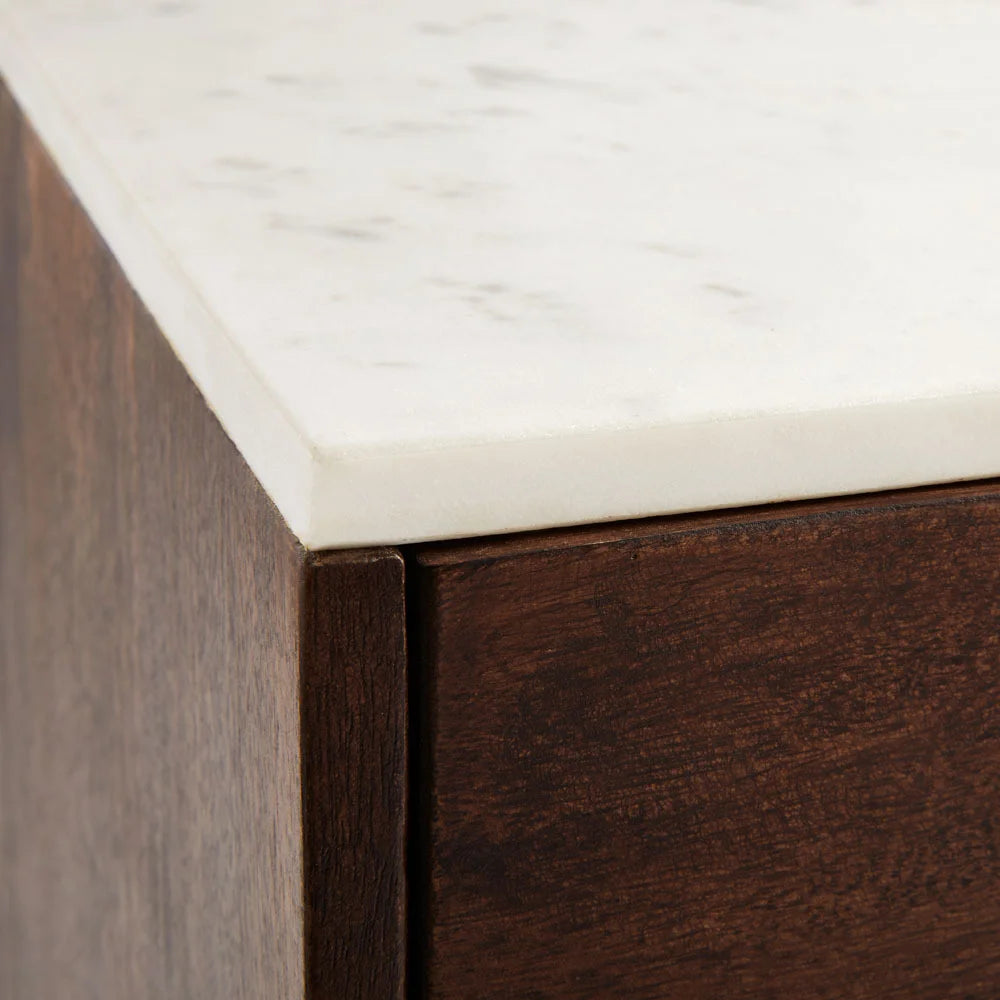 Enhance your bedroom’s ambiance with the Elegant Kamala Bedside Table, featuring a pristine marble accent top. This piece of furniture merges the classic charm of dark, rich wood with the timeless sophistication of marble. With its two spacious drawers, it offers a sleek solution for organizing your nighttime essentials. The metal handles provide a contemporary touch, while the overall design promises to complement both traditional and modern interiors. This bedside table is not just furniture; it’s an investment in style and functionality for your restful retreat.