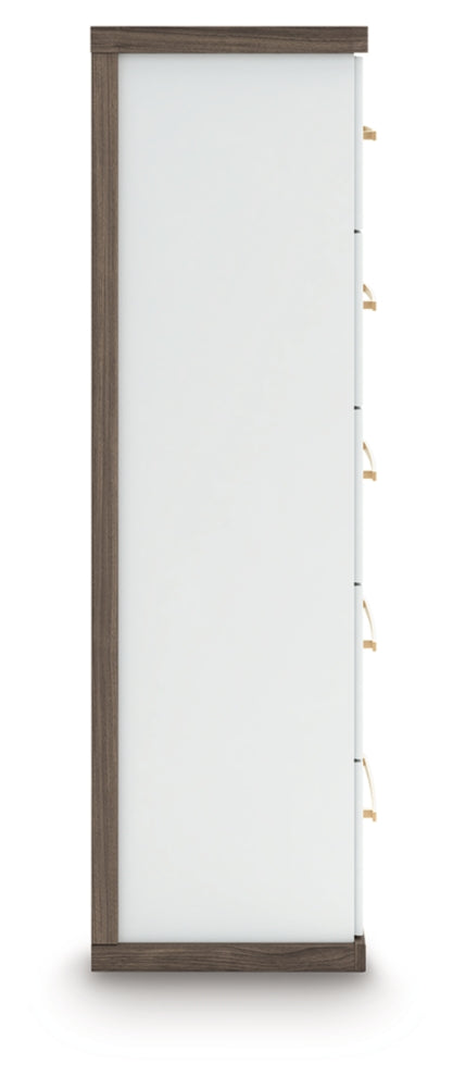 Looking to make a subtly striking statement in your bedroom? We've got you covered. This chest of drawers' sophisticated two-tone treatment marries a warm brown finish over replicated walnut grain with a matte white finish. Rounded corners and a thick top radiate an air of modern panache, while sleek handles in a champagne finish add a sparkling touch to the spacious drawers. It’s a master class in contemporary yet comfortable character.