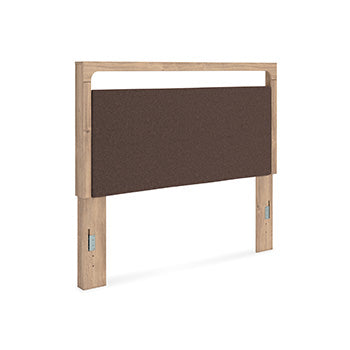 The natural wood tones and clean lines of this king upholstered panel bed echo your easygoing style sensibilities. With a warm finish and replicated oak grain, its carefree character lightens up your bedroom. Curved inner corner details soften the look, while contrasting brown fabric modernizes the feel. And for added function, warm LED lighting adds serene ambiance at the touch of a button.