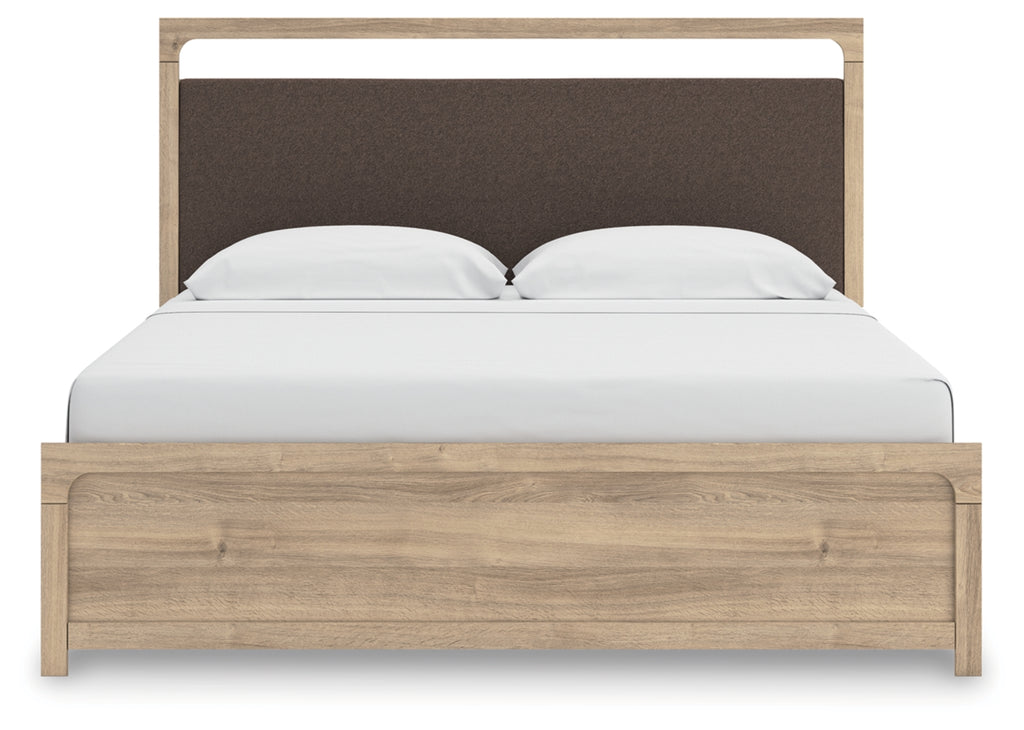 The natural wood tones and clean lines of this king upholstered platform bed echo your easygoing style sensibilities. With a warm finish and replicated oak grain, its carefree character lightens up your bedroom. Curved inner corner details soften the look, while contrasting brown fabric modernizes the feel. And for added function, warm LED lighting adds serene ambiance at the touch of a button.