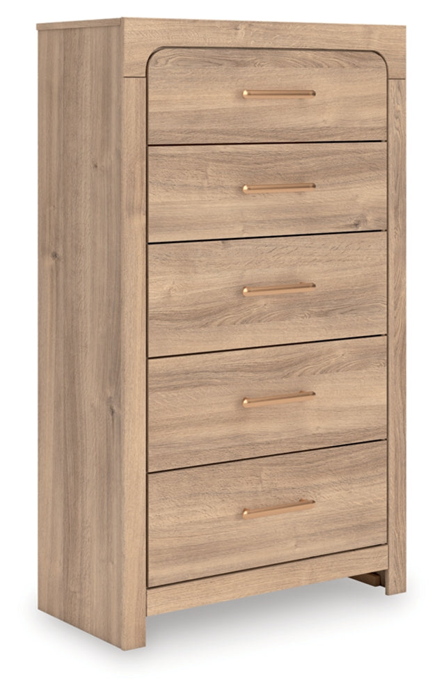 The natural wood tones and clean lines of this bedroom package echo your easygoing style sensibilities. With a warm finish and replicated oak grain, its carefree character lightens up your space. Curved inner corner details soften the look, while sleek bronze-tone hardware modernizes the feel.