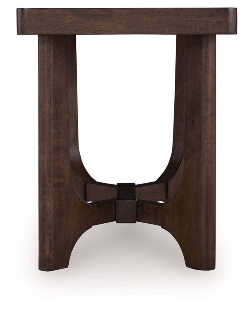 Master the art of casual contemporary design with this end table. Its softly rounded wood frame top pairs perfectly with an eye-catching double wishbone base and a rich brown finish for a decidedly here and now vibe. Talk about the ideal spot for drinks, decor and more.