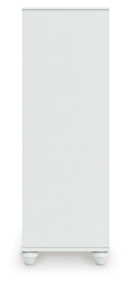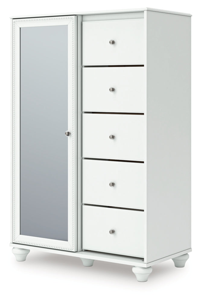 Fit for a princess. This dressing chest’s crisp matte white finish pairs with charming elements like a mirrored door, bun feet and crystal knobs—the perfect crowning touches for your girly girl. Hidden shelves keep toys within easy reach, making your little one feel like royalty.