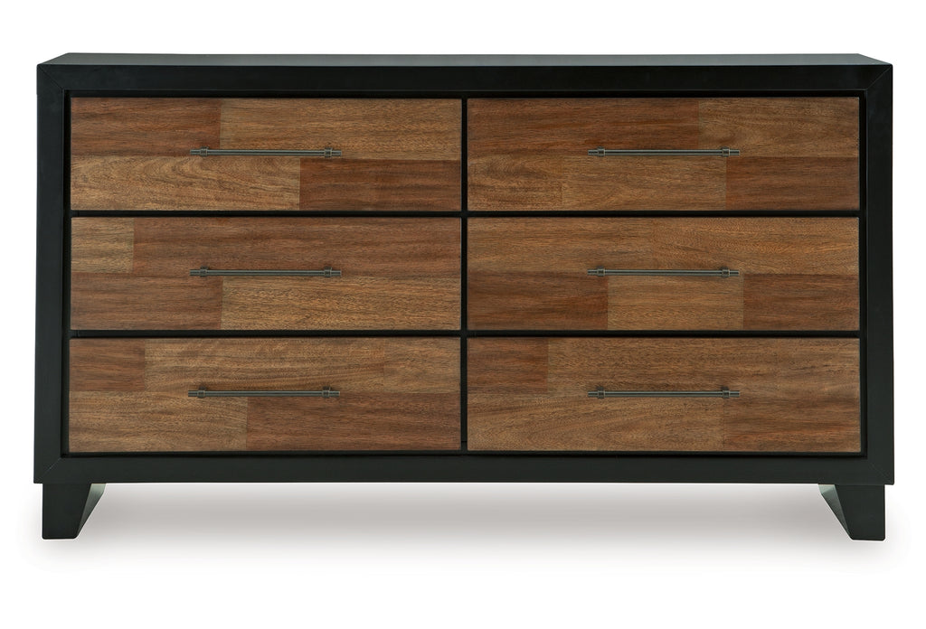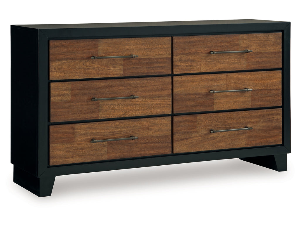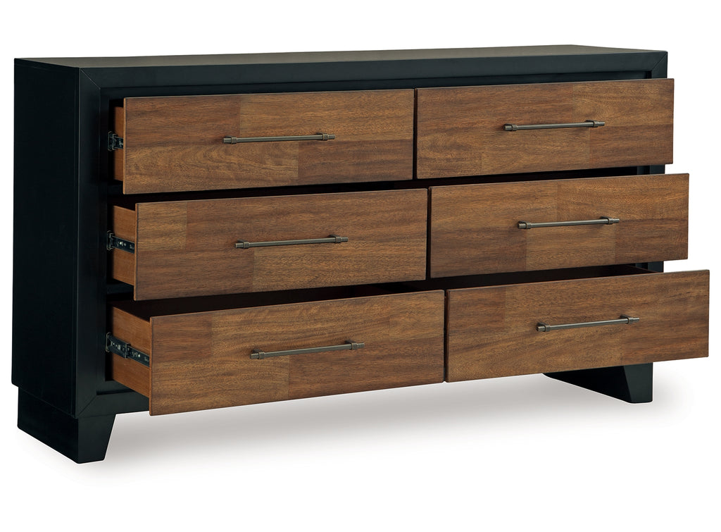 Experience the captivating allure of this dresser, an effortless blend of casual and refined aesthetics. Its two-tone finish combines satin black with a rich brown wood tone for a modern, relaxed vibe that you'll love waking up to. Perfectly suited for your contemporary home, this dresser has plenty of drawer space to tuck away your wardrobe and spare bed linens.