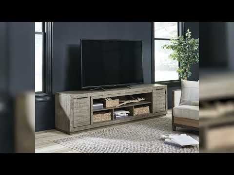 This extra-large TV stand is sure to win your heart with its daring take on modern rustic expression. Its crisp, clean minimalist-chic profile is enriched with striking pine wood grain and a weathered gray finish with distressed saw mark texture. Designed to turn your home theatre room into a style statement, the large center media cabinet can be removed for use with the optional W100-22 electric fireplace (sold separately).