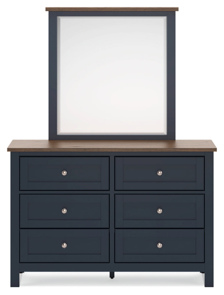 Add homespun charm to your restful retreat. A modern take on a timeless silhouette, this dresser and mirror set pairs a dark slate blue finish with a light brown top. Drawer fronts and legs in a classic Shaker style bring an air of beautiful simplicity to the bedroom. Whether it's part of a charmingly curated guest suite or a casually carefree kids room, this set is a welcome addition.