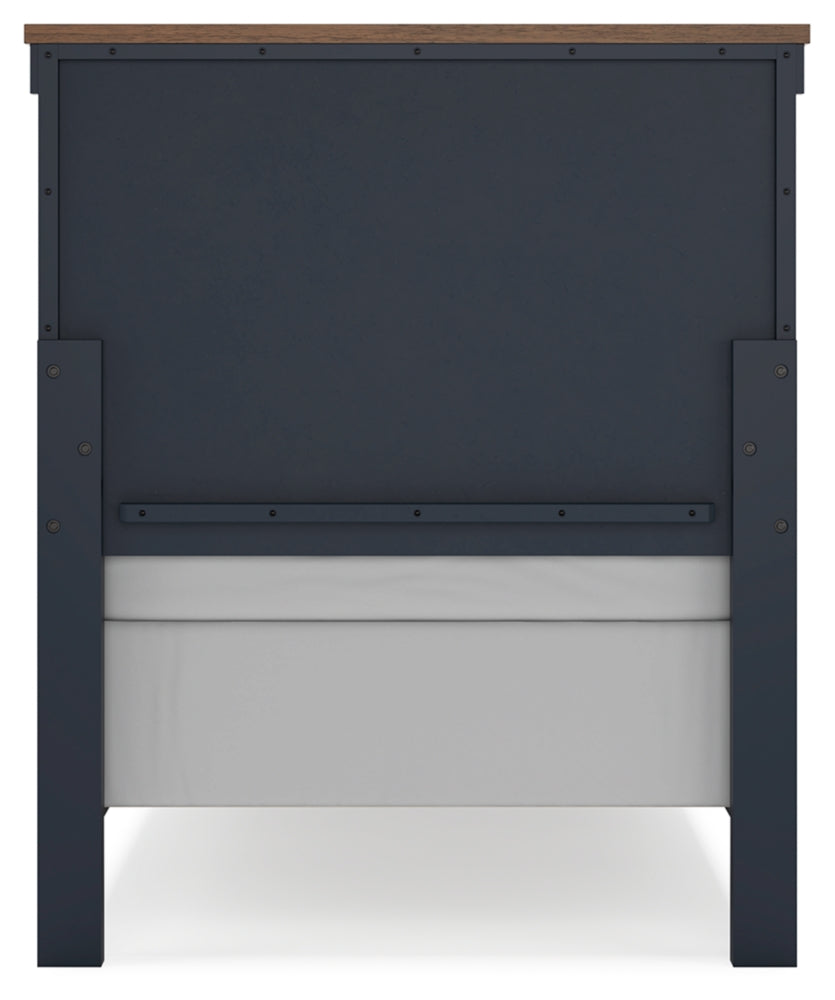 Add homespun charm to your restful retreat. A modern take on a timeless silhouette, this twin panel bed pairs a dark slate blue finish with light brown accents. The slatted headboard in a classic Shaker style brings an air of beautiful simplicity to the bedroom. Whether it's part of a charmingly curated guest suite or a casually carefree kid’s room, this bed is a welcome addition.