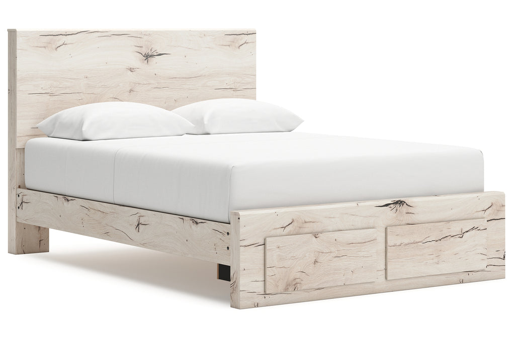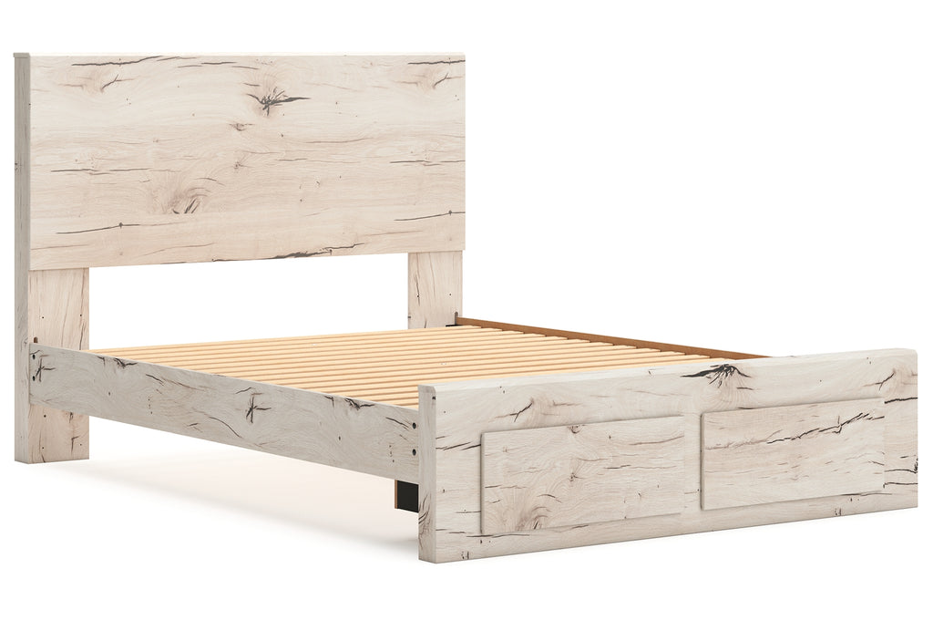 • Includes panel headboard, storage footboard, platform rails and roll slats