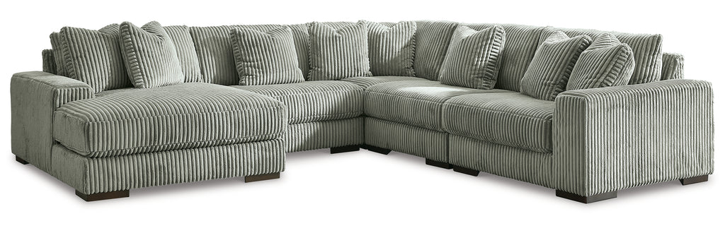 Plush and posh. Showcase your eye for on-trend texture with the statement-making cord upholstery of this sectional and ottoman package. Its stunningly soft fabric entices in a light gray hue, complementing contemporary color palettes. Sink into the cushions and plan to stay a while—this cozy living room seating set highlights your high-end approach to comfort and style.