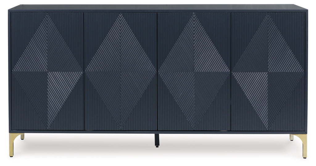Elevate your aesthetic with the chic design of this accent cabinet. Sleek goldtone legs and striking doors with a geometric pattern infuse contemporary flair wherever you place this piece. Add a dark blue finish, and you've got a stunning showstopper. Providing function to form, the cabinet's push magnetic doors reveal two shelves and openings for electronics.