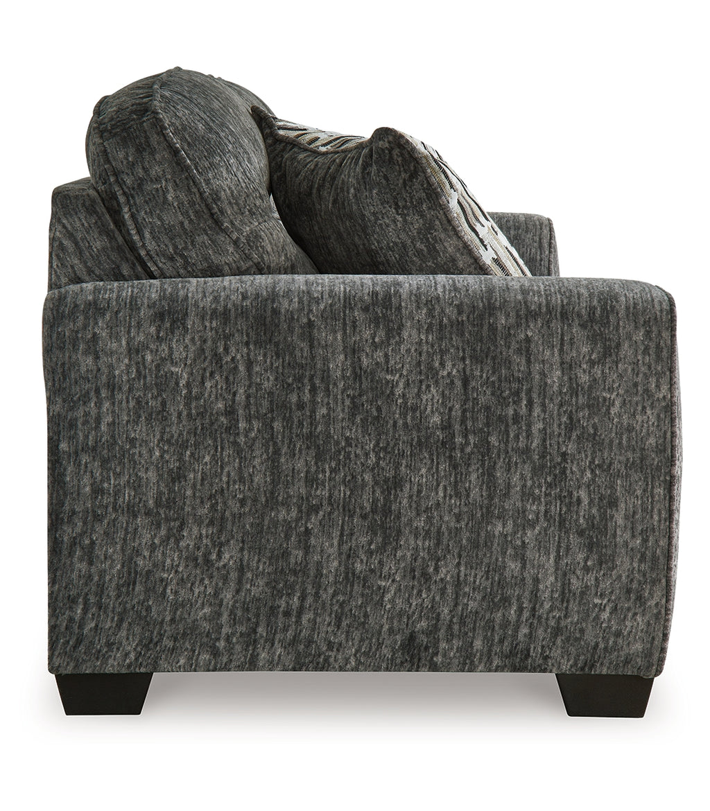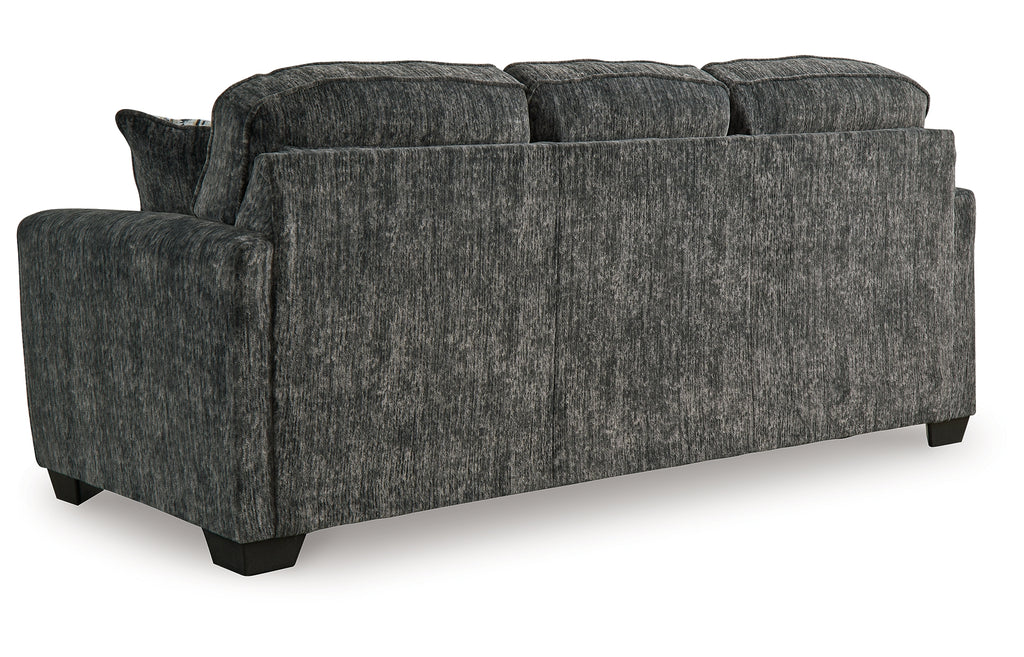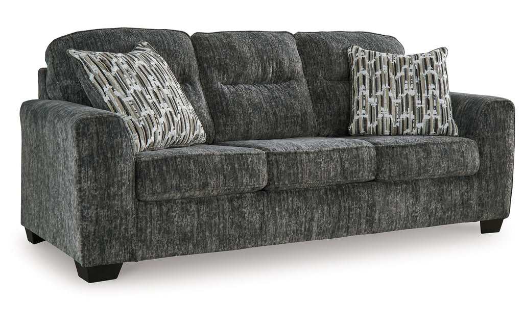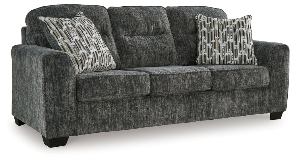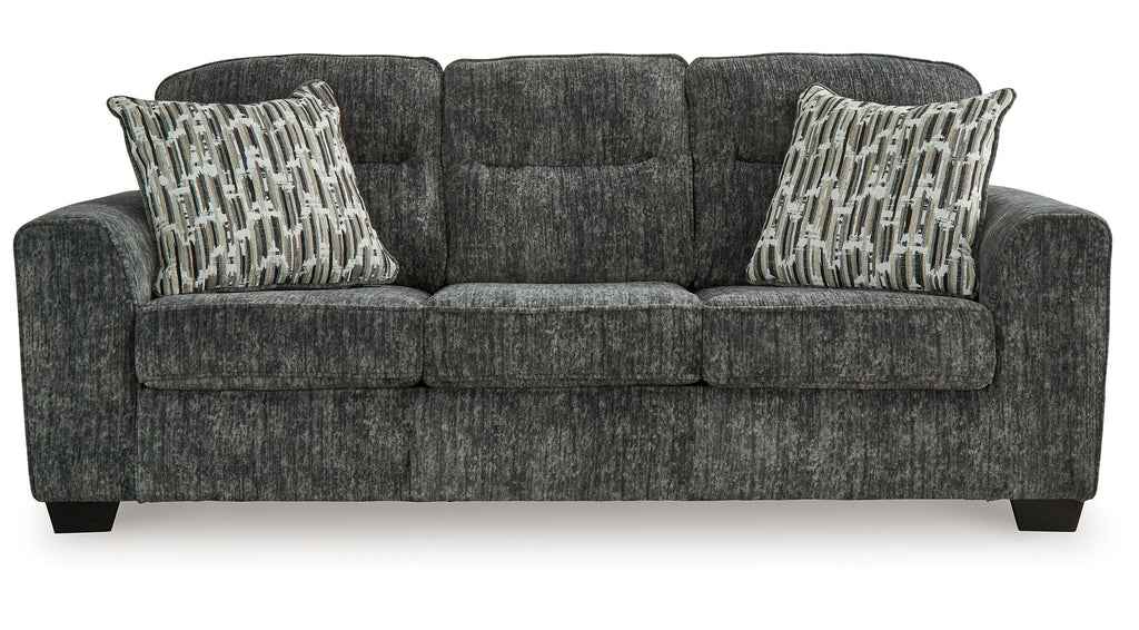 This sofa speaks to those drawn to fresh, contemporary style with richly neutral appeal. Subtle and sophisticated, the plush upholstery and dark tri-block legs are a natural complement for so many color schemes. Two accent pillows make the seating even more welcoming. Curling up on this sofa to enjoy a night in is never out of the question.