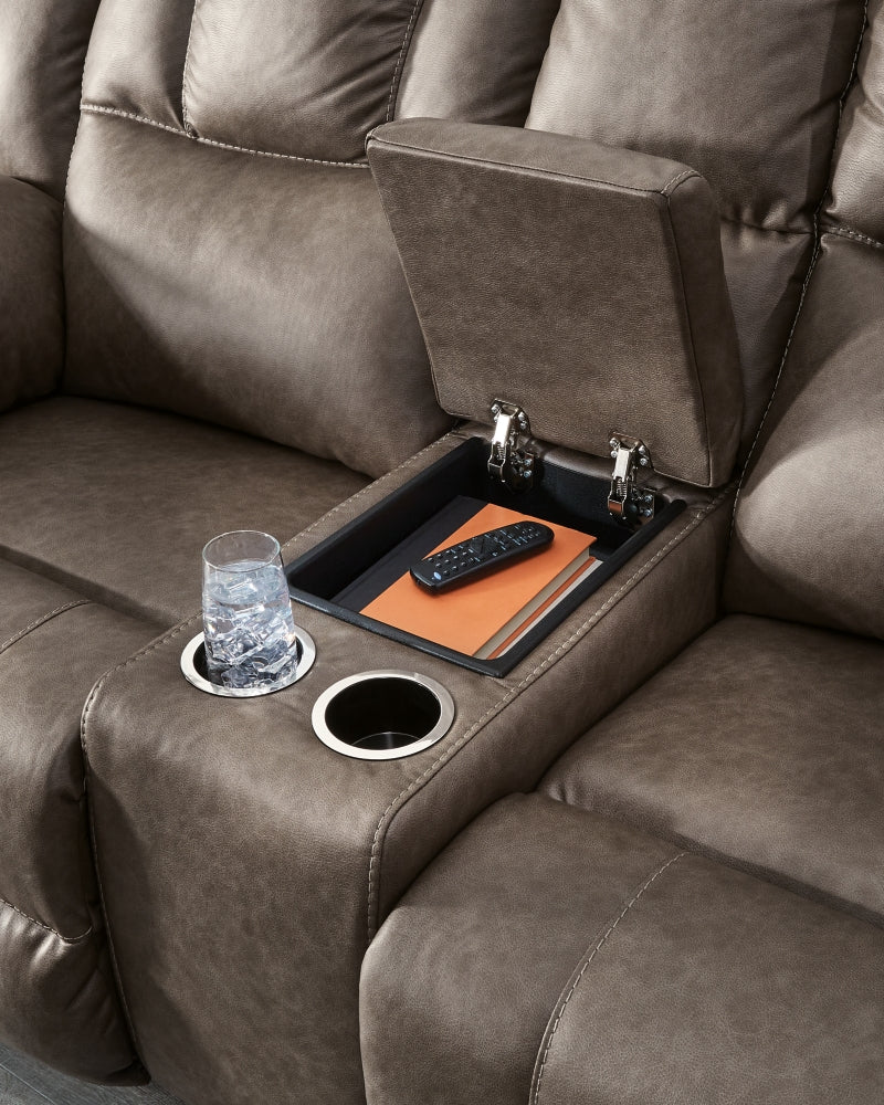 Ready to find your new favorite spot to unwind? This reclining loveseat with console is designed for maximum indulgence, with plush, pillowy cushions that provide wonderful support. Wrapped in supple yet durable faux leather that’s easy to clean, it's just the ticket for movie nights and everyday life. And with one easy pull, you’re on your way to endless relaxation. Talk about the perfect blend of sink-in comfort and inviting contemporary style.