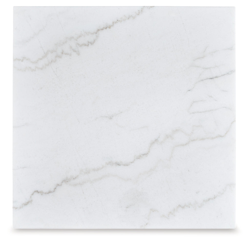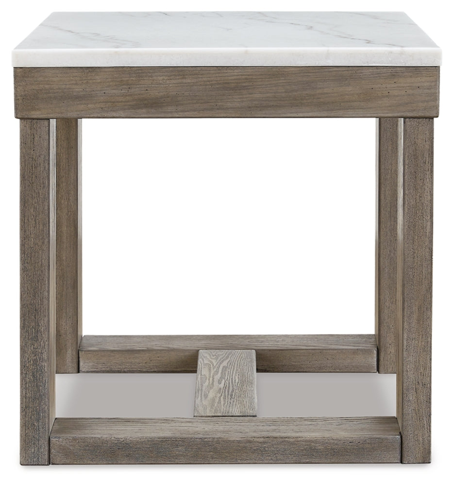 This square end table is simple in design but big on style. Finished with a trend-right grayish brown wood tone, its bold, blocky profile and natural marble top are timeless classic choices that work so well with a variety of settings. Adding to its beauty, the marble top's color variations, fissures, mineral deposits and veining are naturally formed and are not defects.