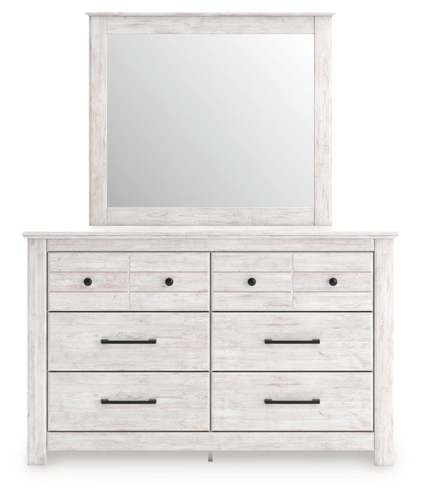 Looking to create a bedroom that feels airy and beautifully put together? This casually comfy dresser with mirror is your perfect solution. Its clean lines, whitewash finish and replicated pine grain exude a charming cottage-inspired feel that brightens your restful retreat. Spacious drawers with dark bronze-tone hardware stow away clothes and more. Now there’s a fresh take on country living we can get behind.