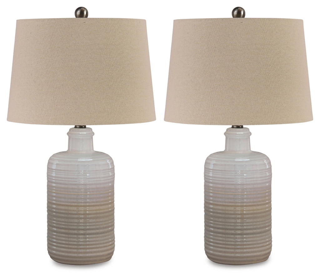 Features- Made of white and taupe glazed ceramic with modified drum shade