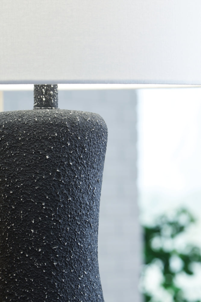 Stunning in its modern elegance, this table lamp knows how to make a statement. A sleek black textured finish accentuates the metal for an upscale look. What a winner by a sofa or bed.