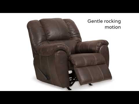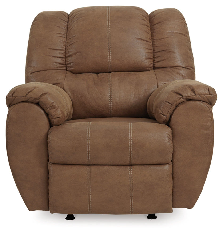 Rock the cool look of leather and the warm feel of fabric with this rocker recliner. Sporting sumptuously thick cushioning, fashion-forward jumbo stitching and a richly tailored aesthetic, this smartly priced recliner with gentle rocking motion is a bestseller for good reason.