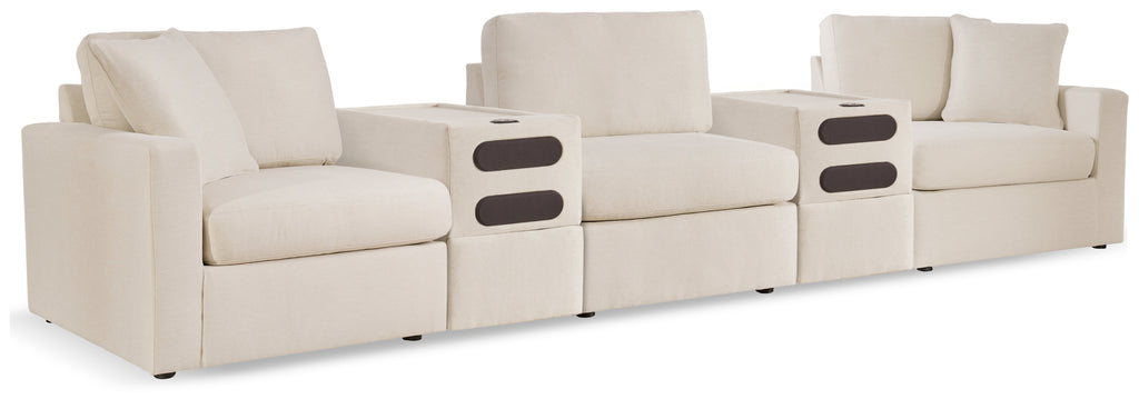 - Includes 5 modular pieces: left-arm facing corner chair, armless chair, 2 consoles with storage and right-arm facing corner chair