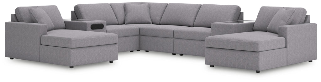 - Includes 8 modular pieces: left-arm facing corner chaise, audio console with storage, console with storage, wedge, 3 armless chairs and right-arm facing corner chaise
