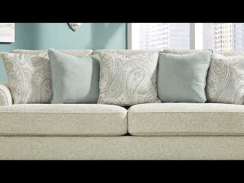 This loveseat strikes a beautiful balance between classic and current. Its traditional elements include t-cushion seating and setback roll arms, angled for modern flair. Posh pillows in spa mist and jacquard paisley make a muted, mellow complement to the loveseat’s casual textured chenille upholstery. And the choice of sandstone beige is a light and lovely style awakening.