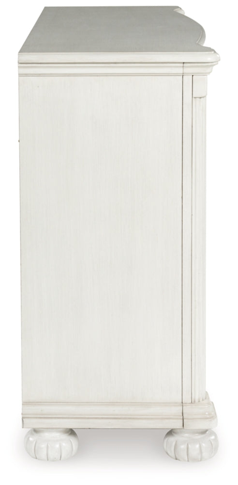 Transform your inner sanctum into a haven of timeless elegance and functionality. This traditionally styled dresser is adorned in a classic antiqued white finish, highlighted by a serpentine-shaped front with thick decorative moulding. Its drawers are packed with ample storage possibilities. And did we mention the stylish reeded bun feet? Talk about relaxed refinement.