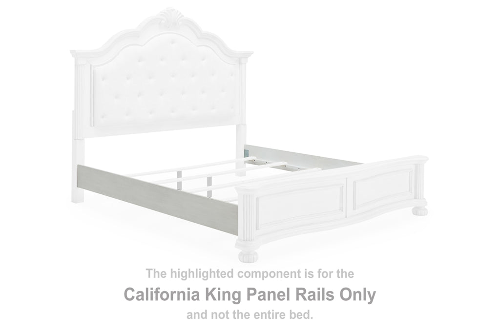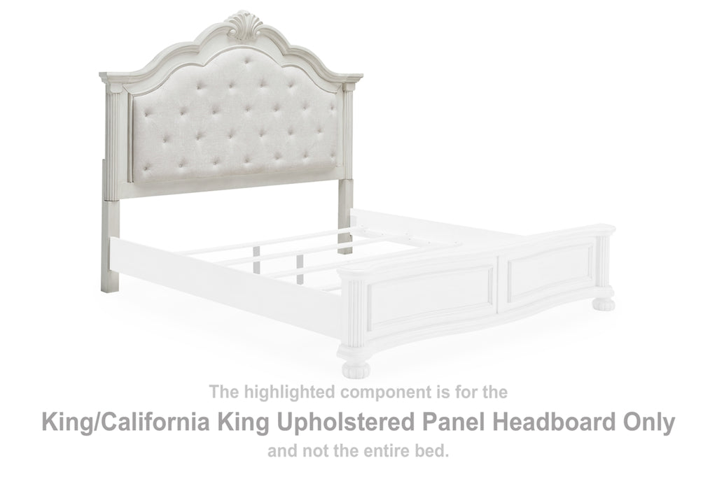 Transform your inner sanctum into a haven of timeless elegance. This traditionally inspired California king upholstered panel bed features a cushioned headboard embellished with a serpentine-shaped crown and light pearl gray upholstery. A contoured footboard with picture frame moulding completes the ageless aesthetic. And did we mention the classic antiqued white finish and stylish reeded bun feet? Talk about relaxed refinement.