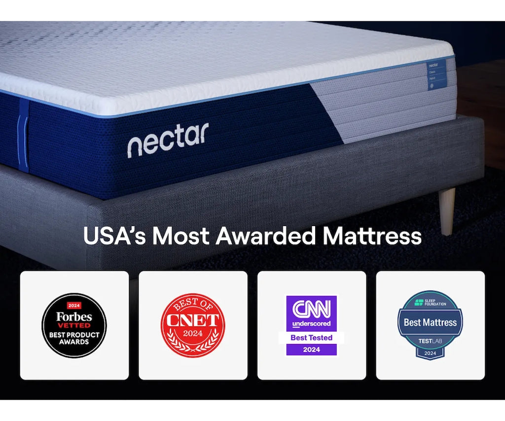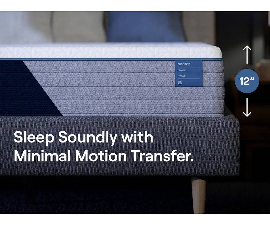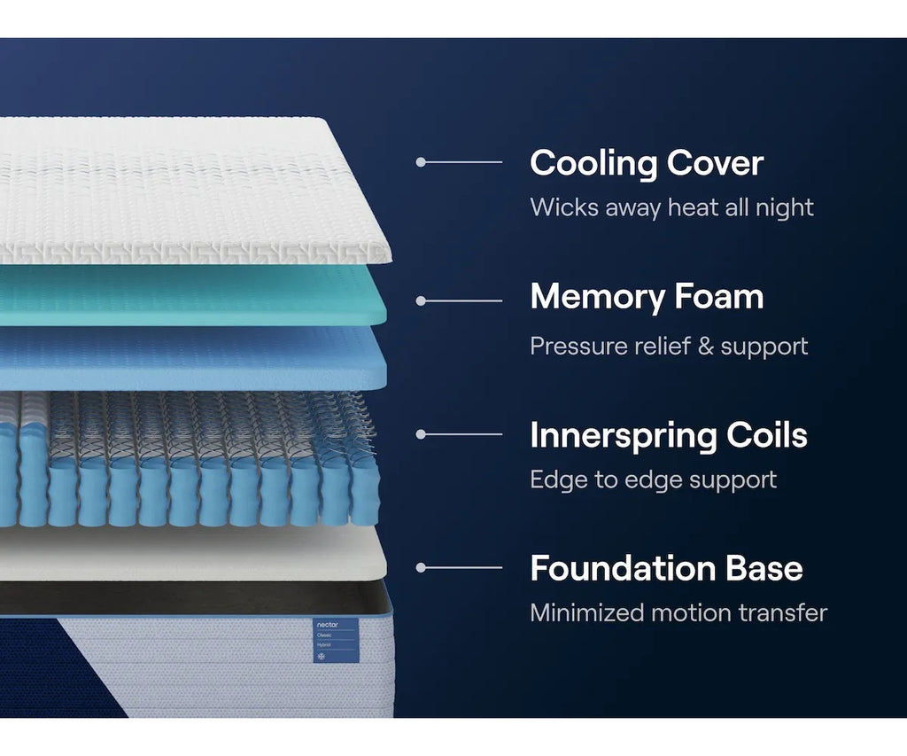 Meet the award-winning Nectar—the better mattress for better mornings. With multiple unique layers of sweet comfort and support, the Nectar Classic Hybrid 5.1 full mattress ensures a refreshing rest. The breathable cooling cover, therapeutic memory foam, individually wrapped coils and support foams work together to keep you cool, cradle your body and minimize motion transfer. It's love at first sleep.