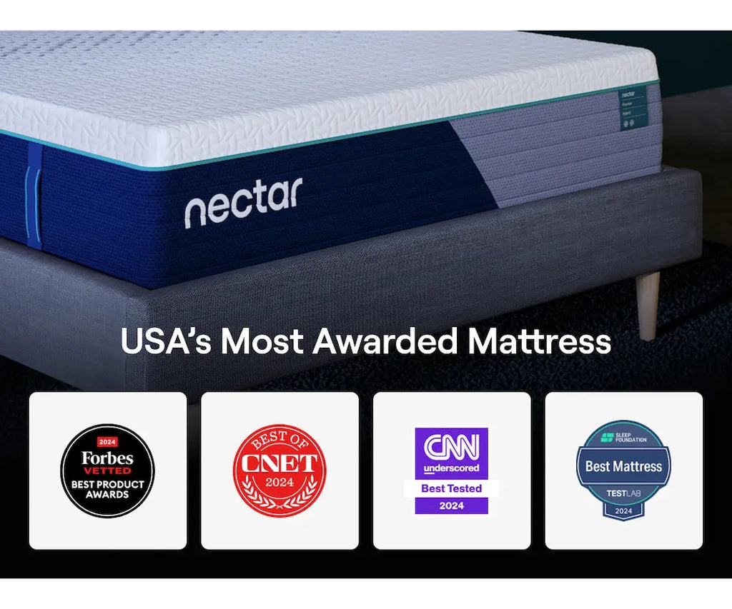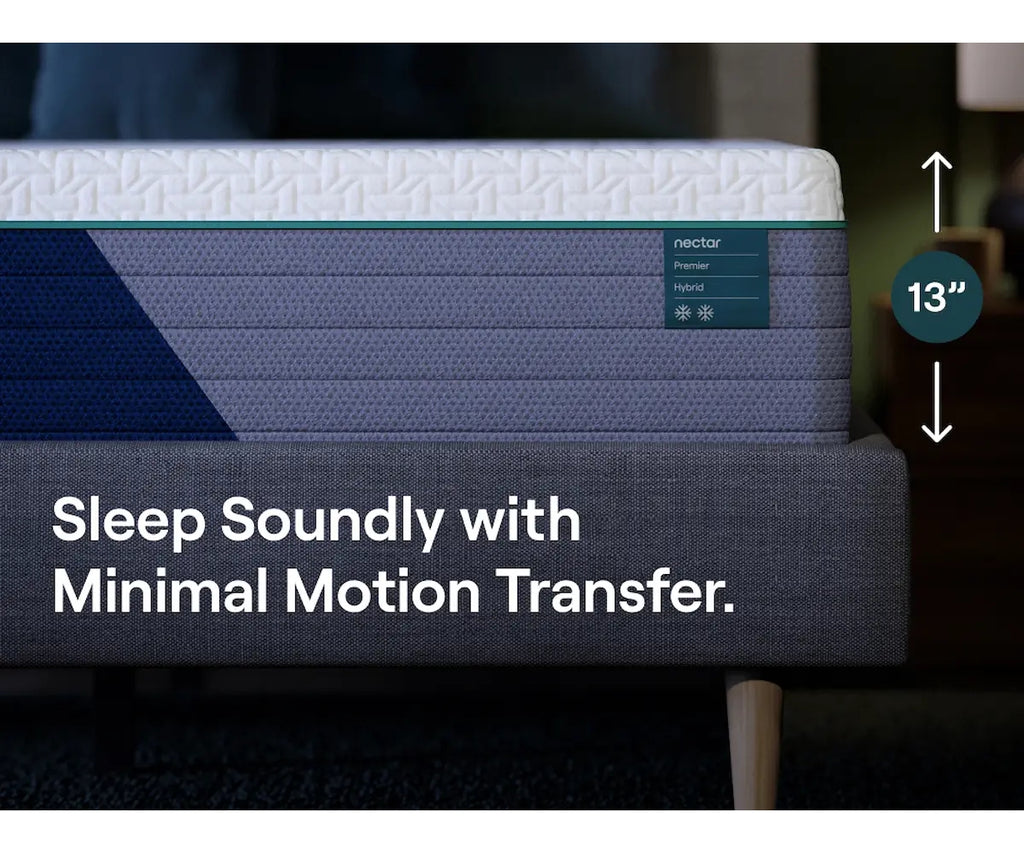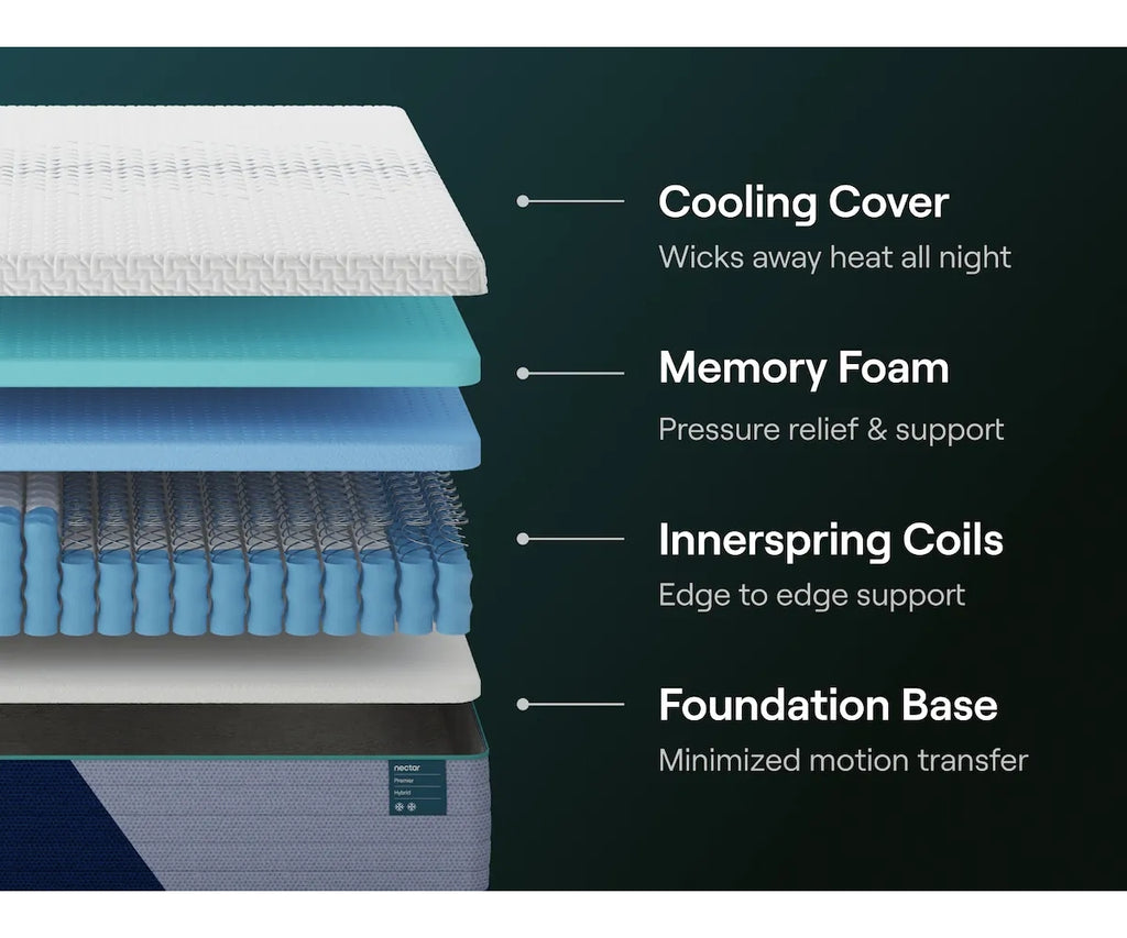 Meet the award-winning Nectar—the better mattress for better mornings. With multiple unique layers of sweet comfort and support, the Nectar Premier Hybrid 5.1 twin mattress ensures a refreshing rest. The breathable cooling cover, therapeutic memory foam, individually wrapped coils and support foams work together to keep you cool, cradle your body and minimize motion transfer. It's love at first sleep.