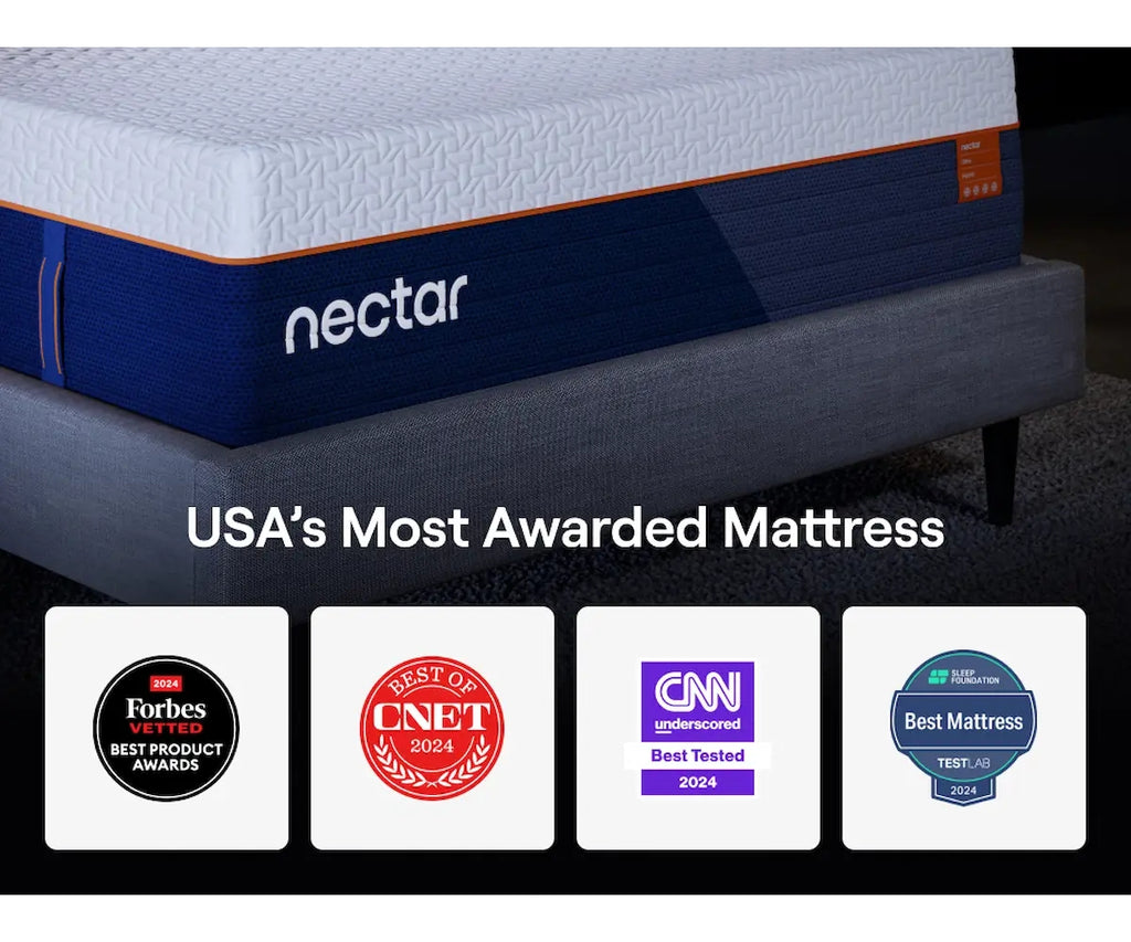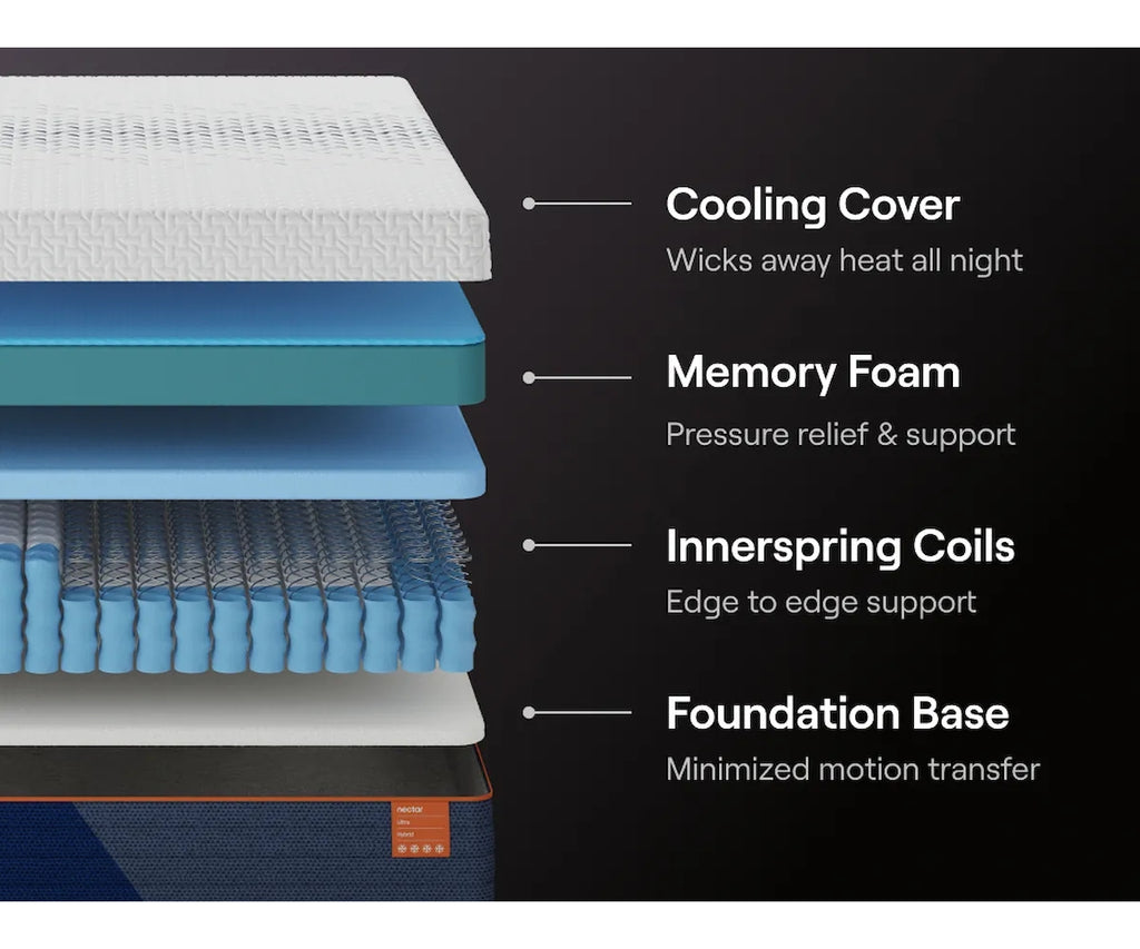 Meet the award-winning Nectar—the better mattress for better mornings. With multiple unique layers of sweet comfort and support, the Nectar Ultra Hybrid 5.1 twin mattress ensures a refreshing rest. The breathable cooling cover, therapeutic memory foam, individually wrapped coils and support foam work together to keep you cool, cradle your body and minimize motion transfer. It's love at first sleep.
