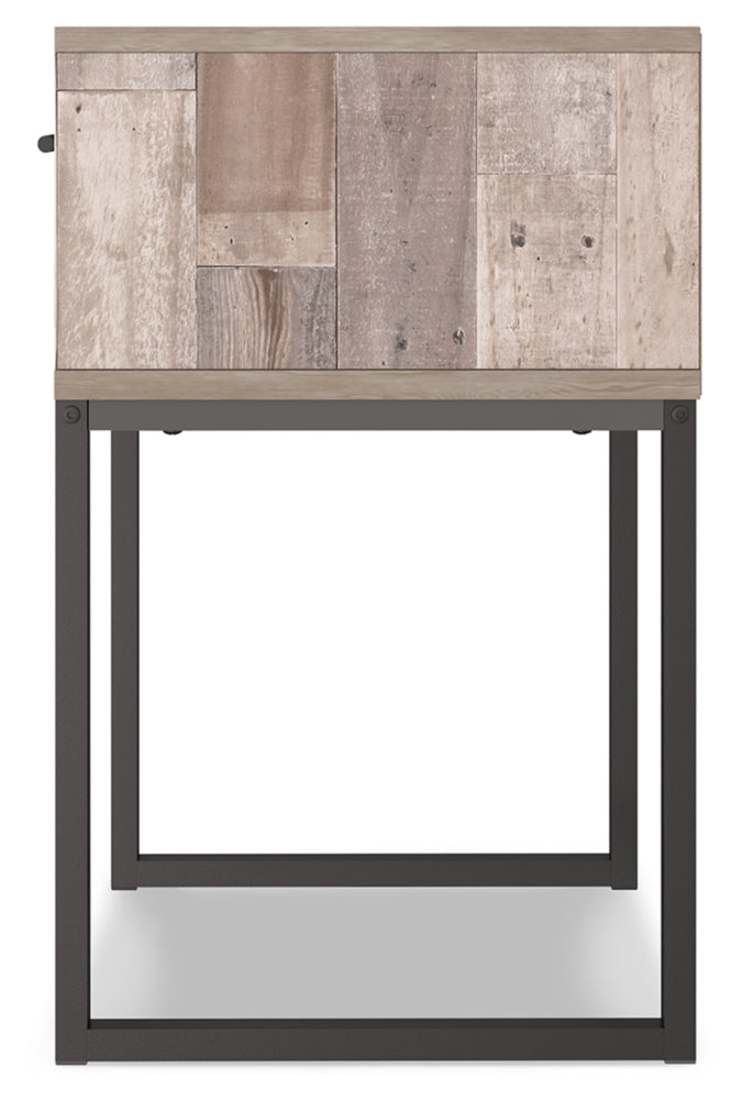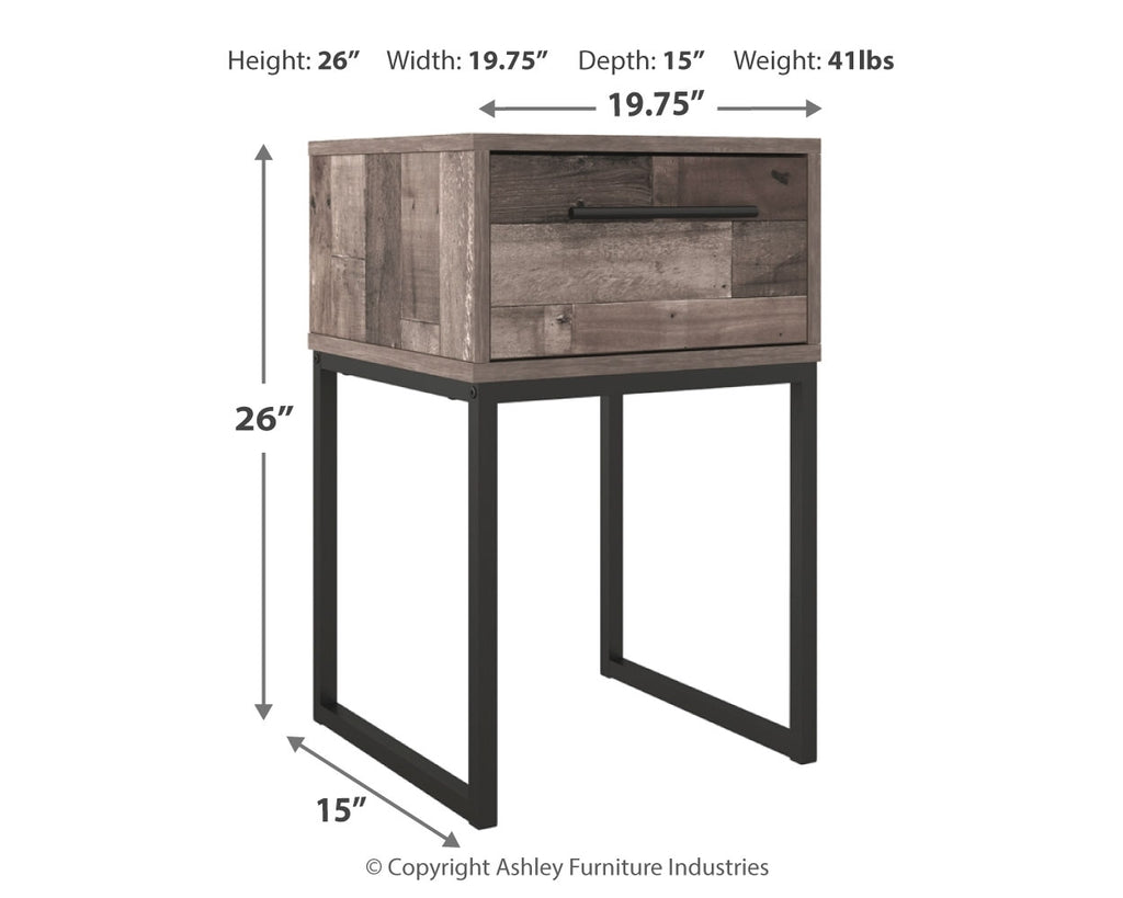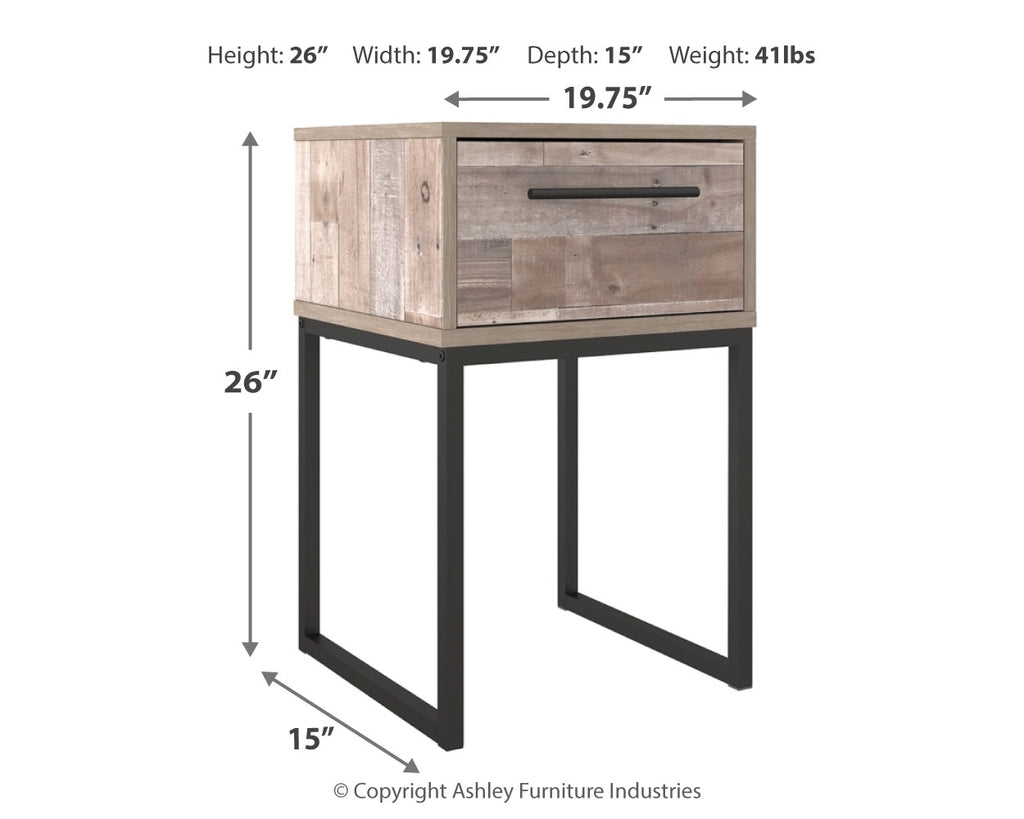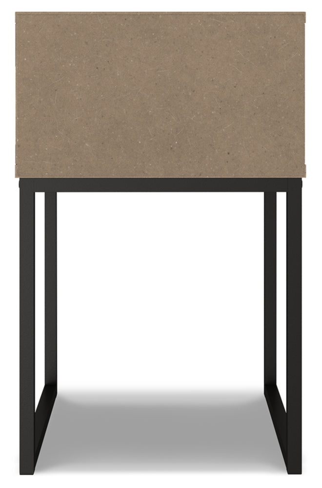 Streamlined design and a stunning finish come together in one simply extraordinary piece. This single drawer nightstand is sure to impress with canted metal legs and a rustic butcher block finish over replicated pine grain texture. Its mid-century profile is a nod to the past, while the updated finish keeps it solidly in the present.