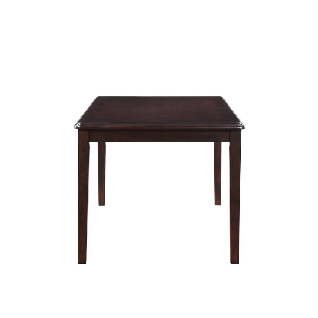 The New Classic Gia 5-Piece Wood Rectangle Dining Set is crafted from solid Rubberwood and Mindi veneers for a perfect blend of durability and aesthetic appeal. The dark ebony finish, achieved through a meticulous multistep process and clear coat, accentuates the natural grain of the wood, adding a touch of timeless elegance to your space. The 60-inch dining table comfortably accommodates up to six people, making it an ideal gathering place for family dinners or game nights. The dining chairs, with their distinctive interlocking chain back design, provide both style and comfort with black PU upholstered cushions. Supported by sturdy solid wood legs, these chairs are built to last. Tapered legs and clean lines complete the transitional look of this set. Your purchase includes the easy to assemble dining table and four chairs. Plus, enjoy peace of mind with a one-year warranty. Upgrade your dining area today with this classic and functional dining set.