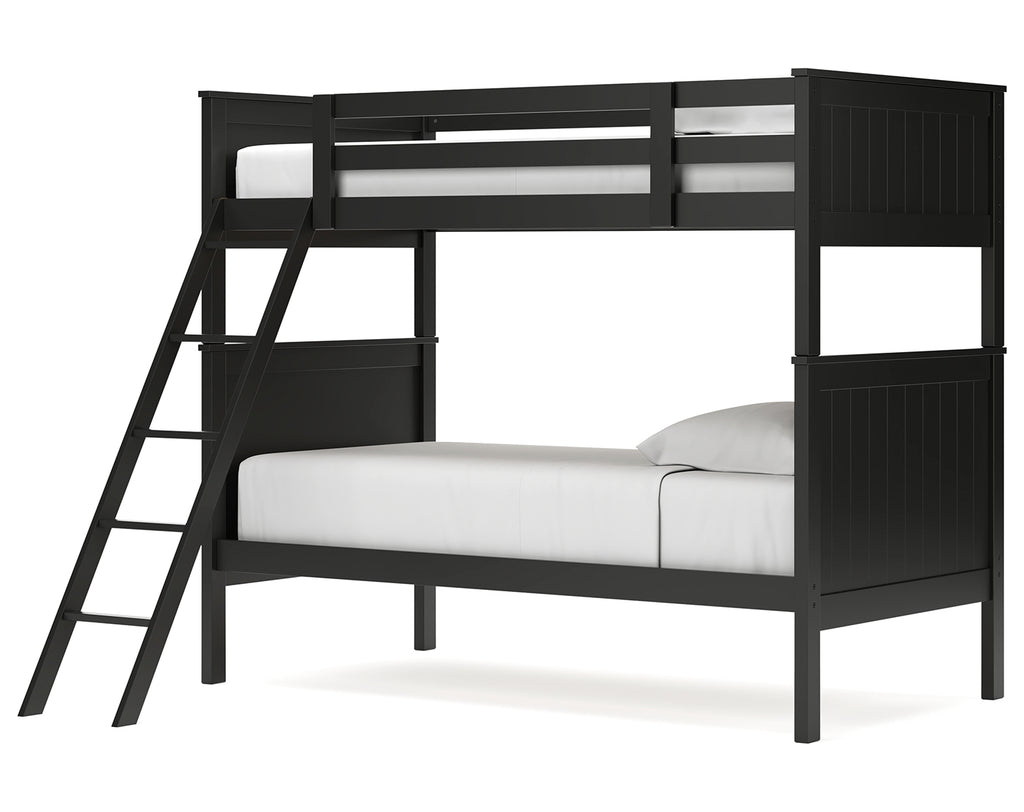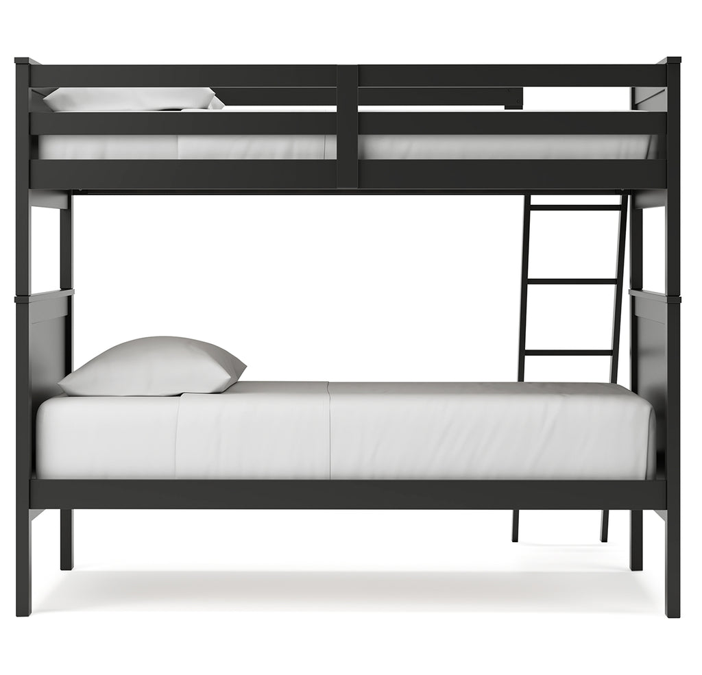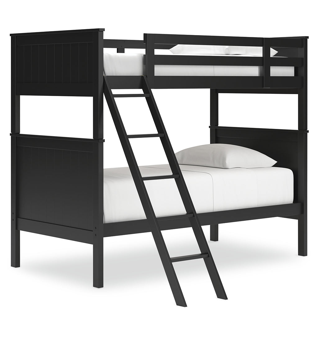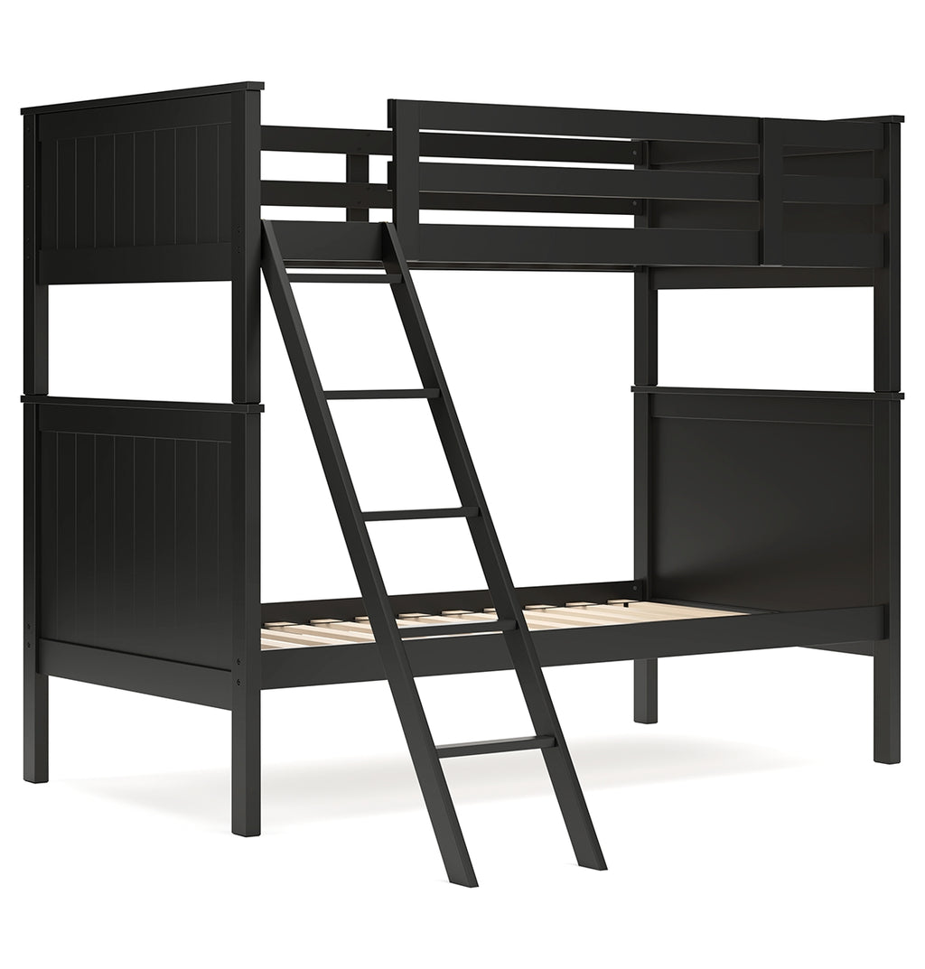 Maximize space and turn your kids' bedtime into an adventure with this cool twin-over-twin bunk bed. It's an effortless addition to any bedroom, with a timeless Shaker style that's wonderfully finished in black. Guard rails on the top bunk help everyone get a good night’s rest. And the simplified design means easy assembly. Who doesn’t like that?