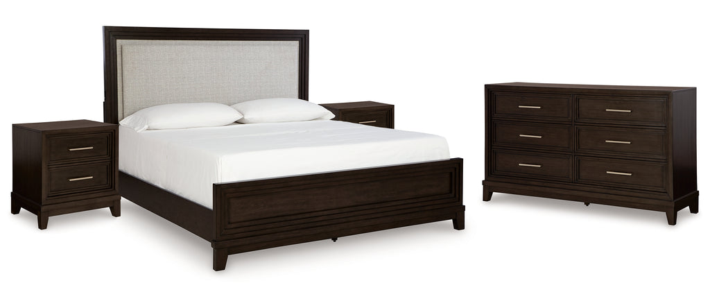 Neymorton Queen Upholstered Panel Bed with Dresser and 2 Nightstands
