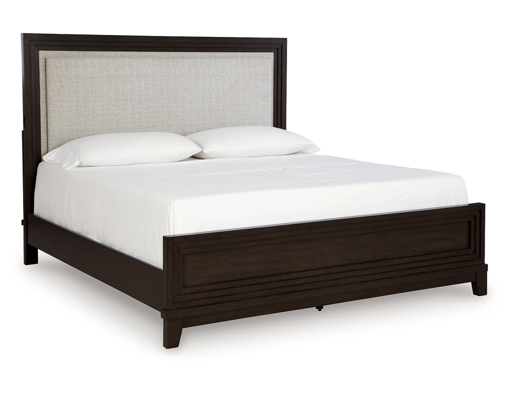 • Includes upholstered panel headboard, panel rails and panel footboard with slats