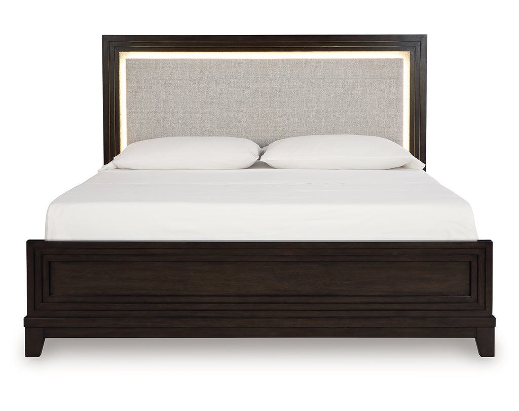 Neymorton Queen Upholstered Panel Bed with Mirrored Dresser, Chest and 2 Nightstands
