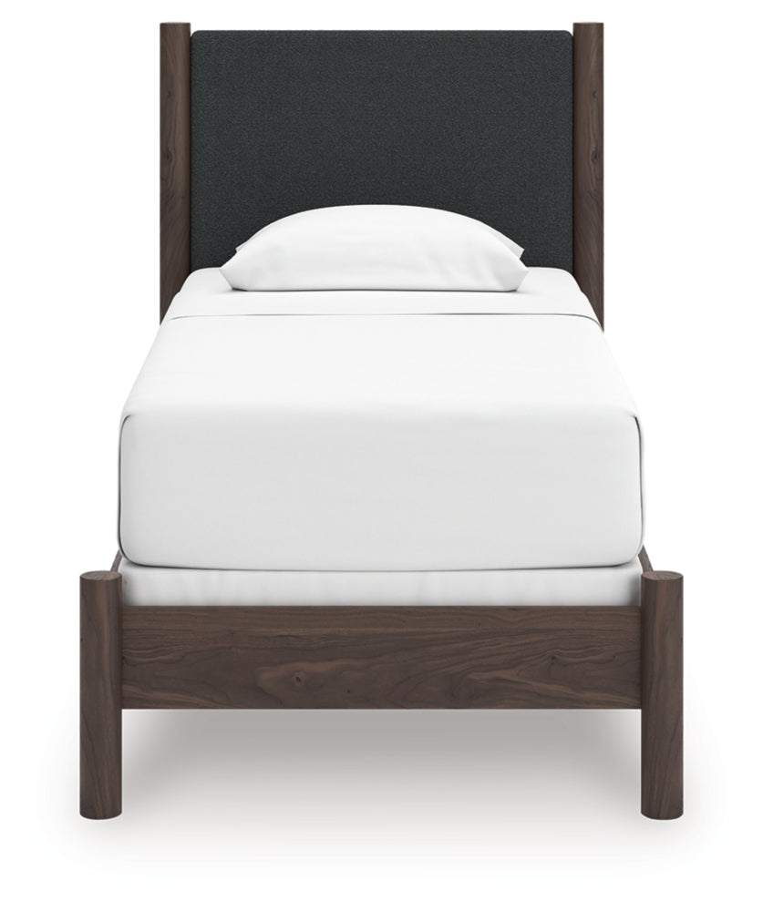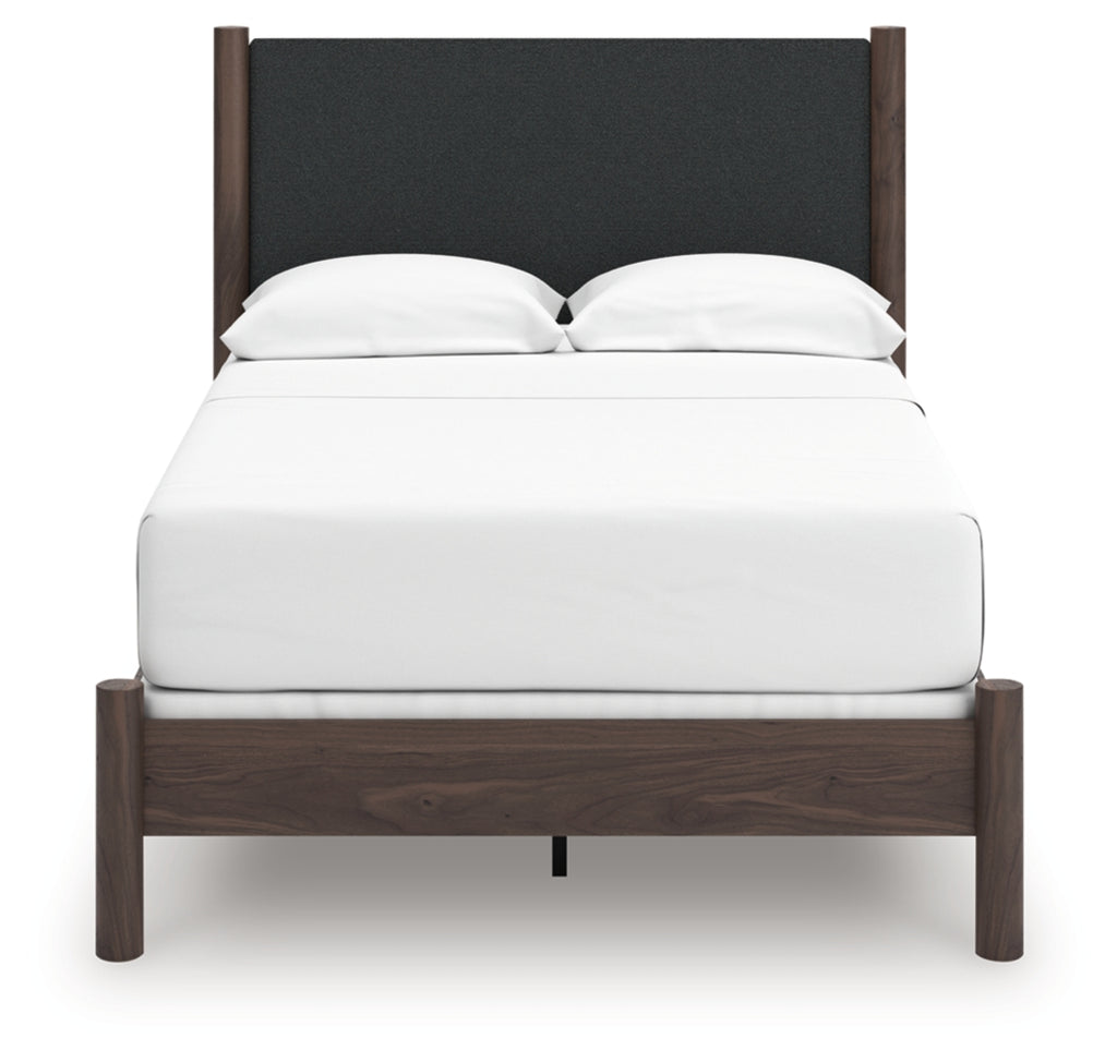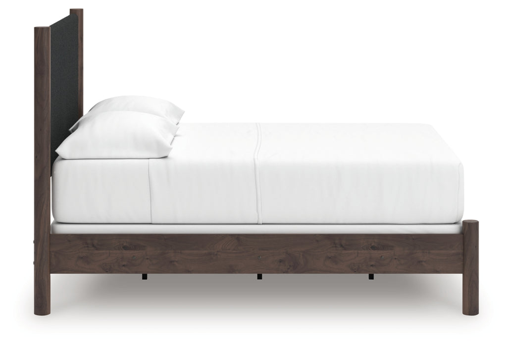 Crafted with both form and function in mind, this queen upholstered panel bed brings a dash of retro-cool character to your modern boho aesthetic. Its textured black headboard fabric adds a trend-right touch to the classic silhouette. Warmly welcoming with a rich brown finish, the bed pairs well with muted hues, earth tones and other neutrals alike. What a refined take on easygoing style.