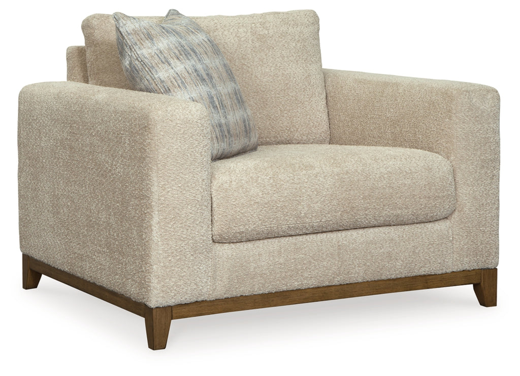 Serene style with a modern sensibility. Delight in the cozy, versatile embrace of this oversized chair. It takes an on-trend approach to irresistible texture and natural beauty, showcasing soft upholstery accented with a transitional wood trim. As refined as it is laid back, the chair also keeps comfort a priority with a plush, thick seat cushion.