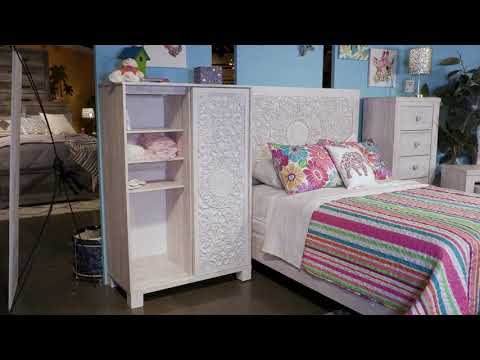 A one-of-a-kind girl deserves a bedroom retreat that celebrates her personal flair—and this boho-chic chest of drawers is so befitting. Wowing with an artful, carved-effect sliding door and richly distressed whitewash finish, this five-drawer chest with additional shelved storage is packed with possibilities.